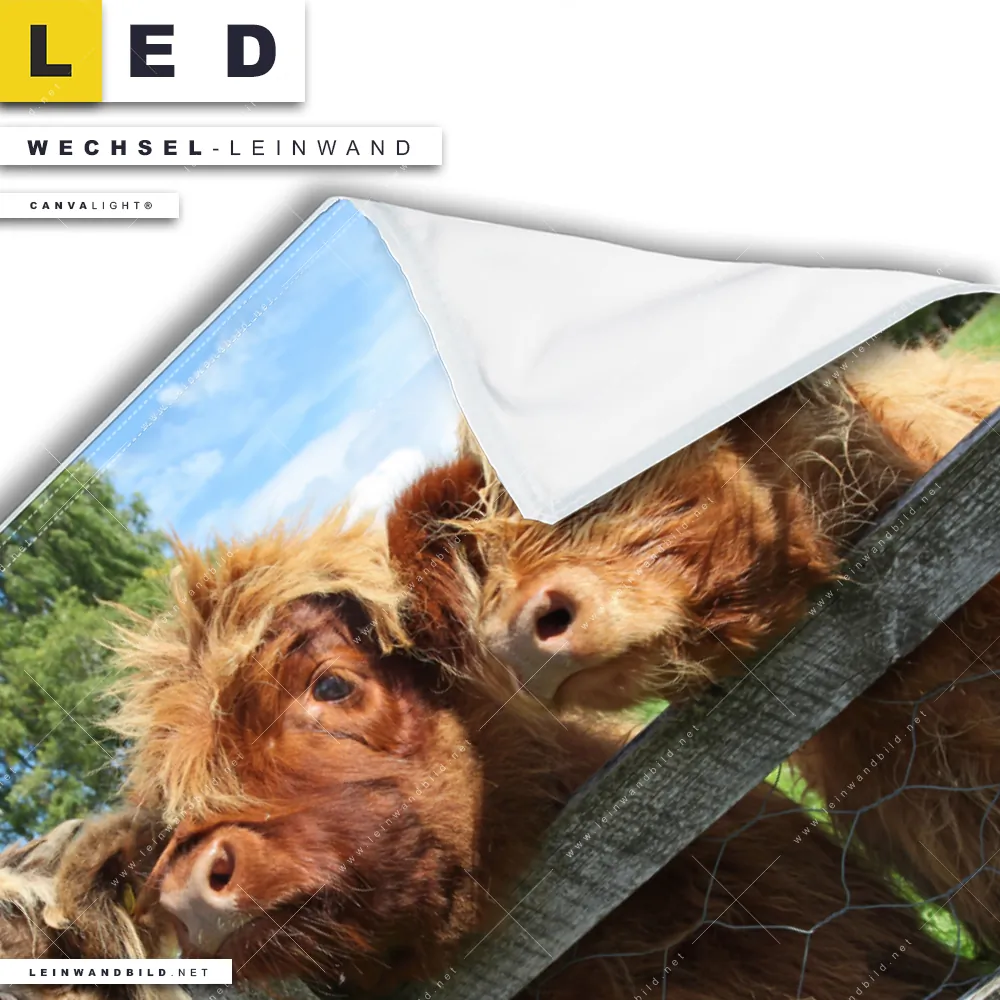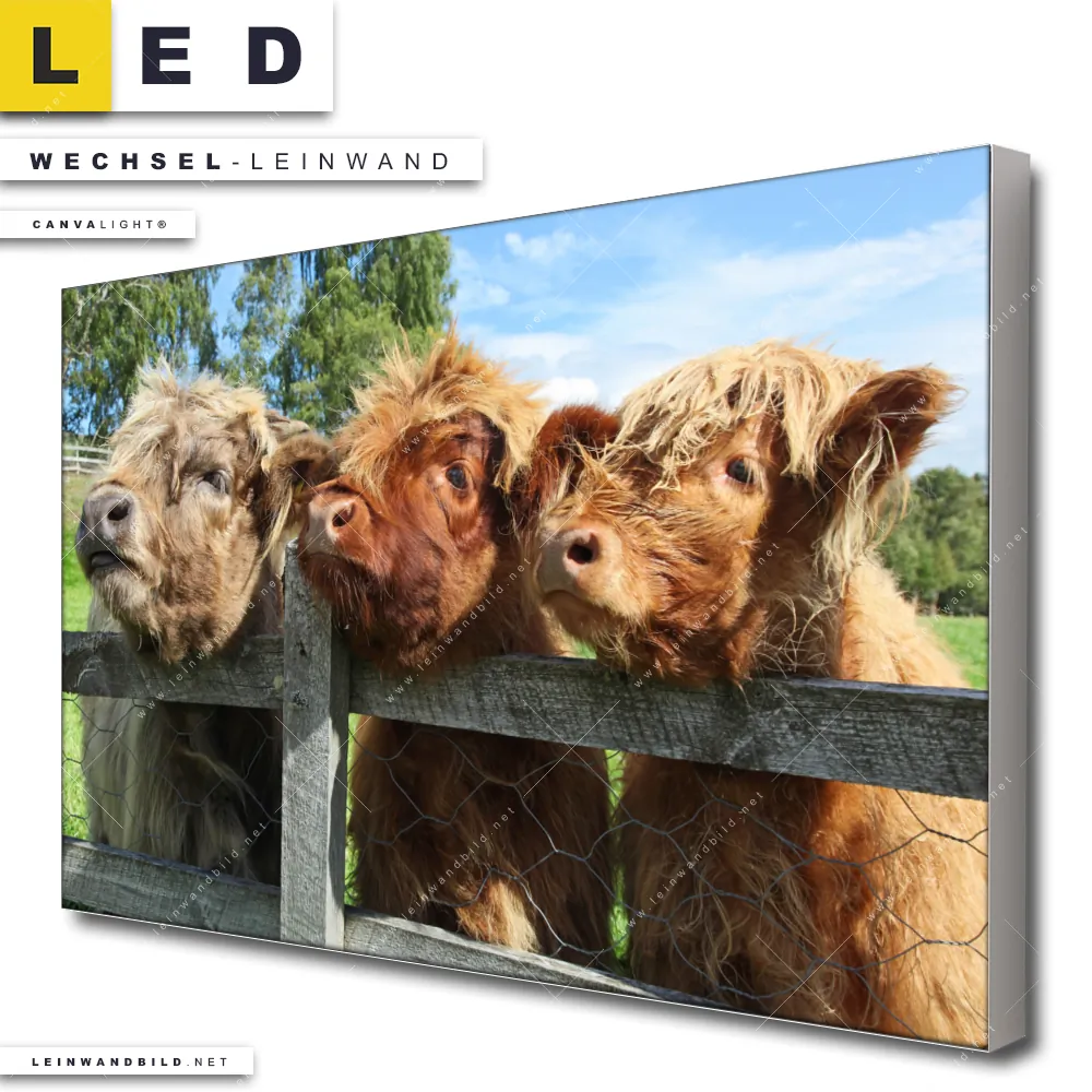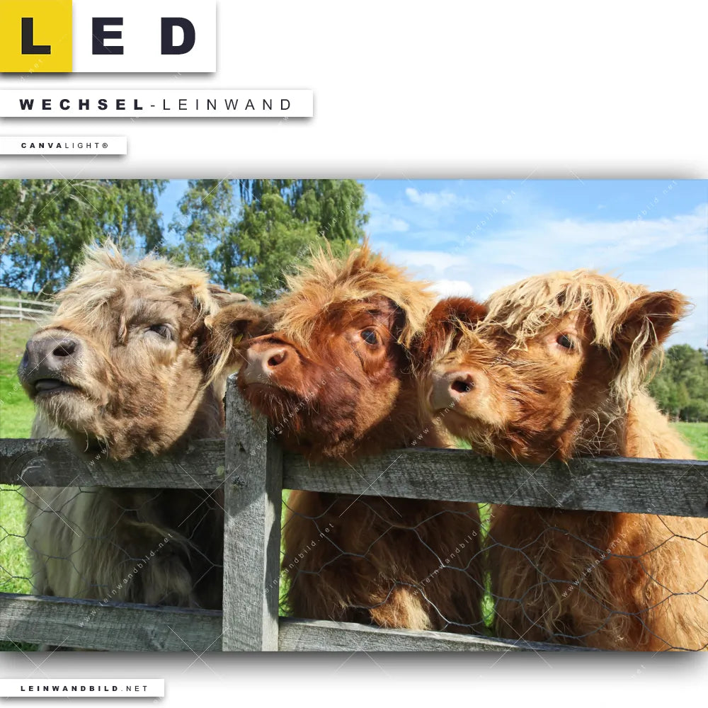 LED Wechsel-Leinwand Canvalight® TEX | Drei Schottische Rinder | Querformat
