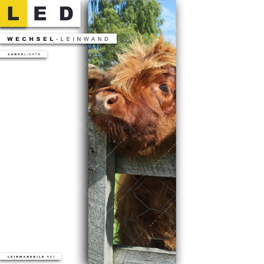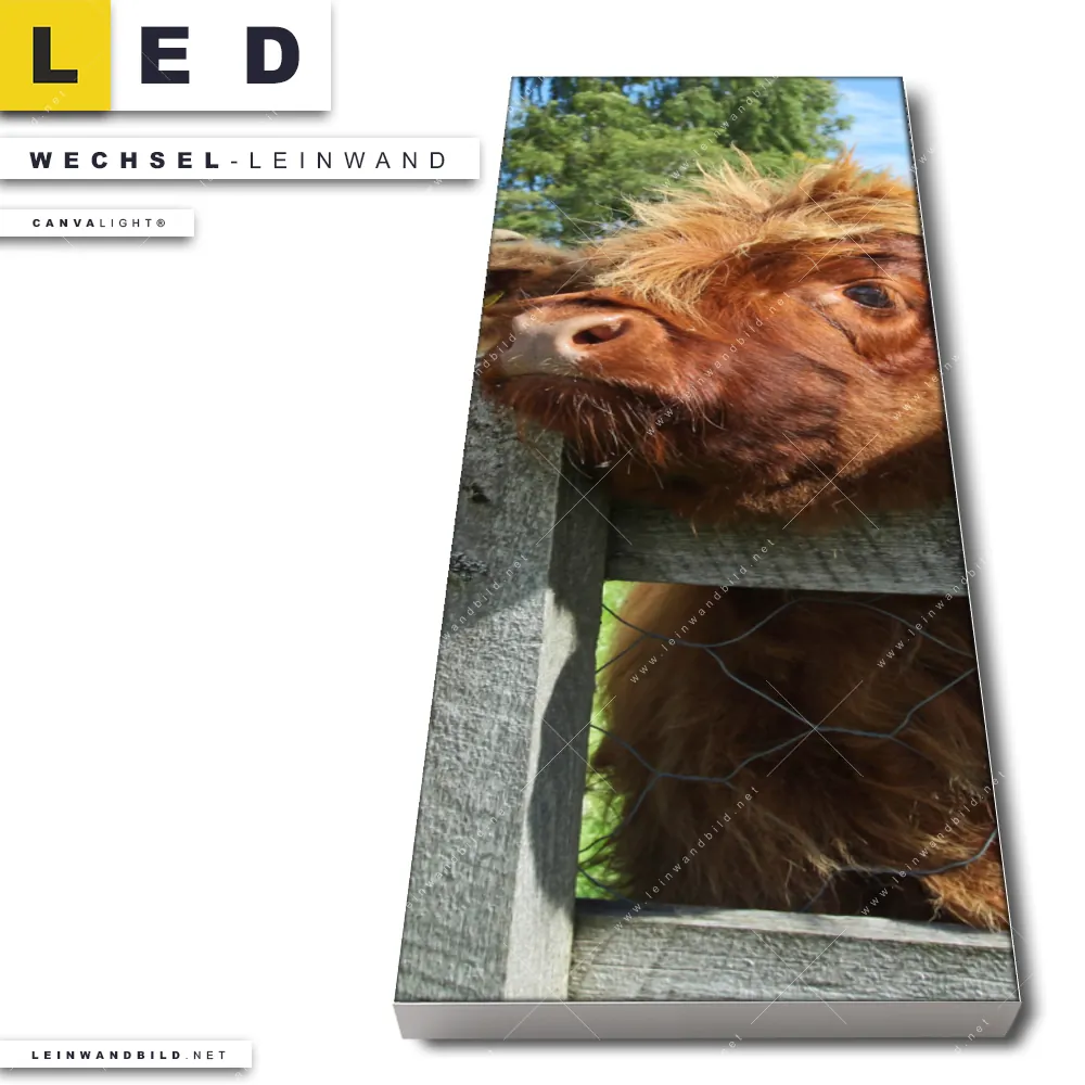 Dann sollte die Wechsel-Leinwand Canvalight® TEX | Drei Schottische Rinder | Schmal den Weg zu Dir finden. Die Austausch-Leinwand Rinder schauen über Zaun - passend für unsere stufenlos dimmbaren, steckerfertigen Leinwandbilder im LED Leuchtrahmen mit Fernbedienung und optionaler Farbtemperatursteuerung - fügt sich als Eye-Catcher harmonisch in jedes Bar - Gastronomie, Wohnzimmer - Schlafzimmer, Arzt - Praxis, Büro - Kanzlei Raumkonzept ein.