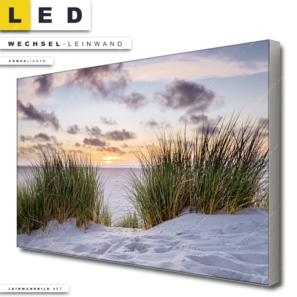 Du konfigurierst Deine individuelle LED Wechsel-Leinwand Canvalight® TEX | Dünen und Abendsonne | Querformat und wir produzieren sie NEU für Dich. Unsere Strand - Meer, Landschaften Austausch-Fotoleinwände für Canvalight® LED Bilder sind KEINE Lagerware. Du bist Dir unsicher, welches Motiv oder Format das richtige für dein individuelles LED Wechselmotiv auf Leinwand ist, dann helfen wir dir gerne weiter und beraten dich!
