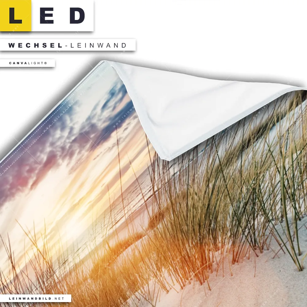 Du konfigurierst Deine individuelle LED Wechsel-Leinwand Canvalight® TEX | Dünen und Meer | Querformat und wir produzieren sie NEU für Dich. Unsere Landschaften, Strand - Meer Austausch-Fotoleinwände für Canvalight® LED Bilder sind KEINE Lagerware. Du bist Dir unsicher, welches Motiv oder Format das richtige für dein individuelles LED Wechselmotiv auf Leinwand ist, dann helfen wir dir gerne weiter und beraten dich!