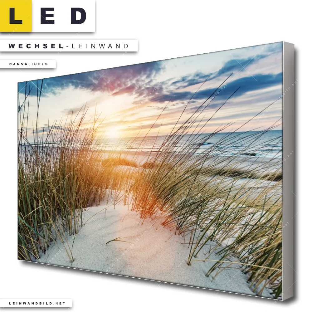 Du bist auf der Suche nach einer Landschaften, Strand - Meer Wechsel-Leinwand für Dein LED-Leinwandbild im Querformat? Begriffe wie Deutschland, Sommer, Ostsee - Nordsee, Urlaub - Reisen, Sonnenuntergang - Sonnenaufgang, Dünen, Gräser, Frühling haben Dich auf der Suche nach Deiner Ersatz-Leinwand für dein breites LED Wandbild mit wechselbarer Leinwand inspiriert? Farben wie Grün, Beige, Blau dürfen auf Deinem neuen Wechselmotiv für Dein XXL Leinwand-LED-Bild nicht fehlen und Leinwände im Natürlich - Realistisch, Retro - Vintage Stil für Leuchtbilder passen perfekt zu Deinem Einrichtungsstil?
