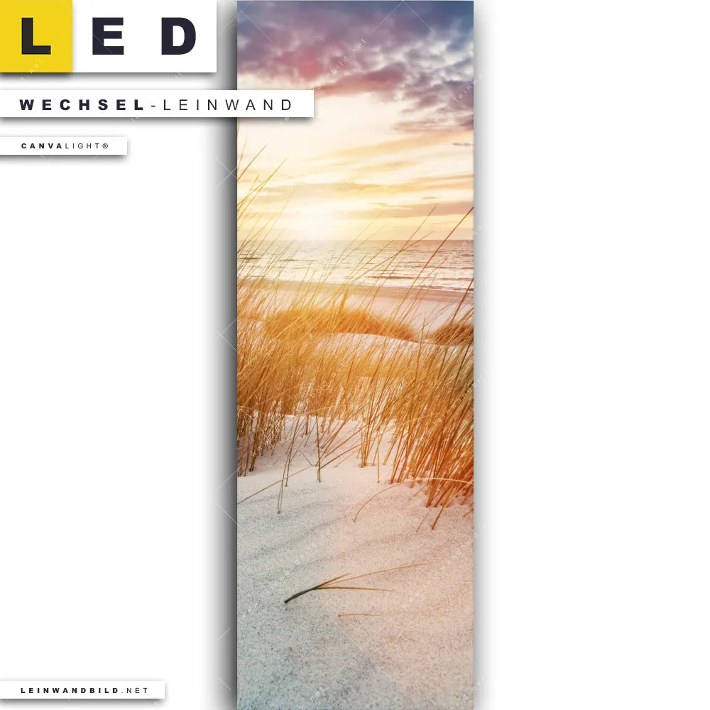 Du bist auf der Suche nach einer Landschaften, Strand - Meer Wechsel-Leinwand für Dein LED-Leinwandbild im Schmalen Format? Begriffe wie Deutschland, Sommer, Ostsee - Nordsee, Urlaub - Reisen, Sonnenuntergang - Sonnenaufgang, Dünen, Gräser, Frühling haben Dich auf der Suche nach Deiner Ersatz-Leinwand für dein LED Wandbild im Panorama-Hochformat mit wechselbarer Leinwand inspiriert? Farben wie Grün, Beige, Blau dürfen auf Deinem neuen Wechselmotiv für Dein XXL Leinwand-LED-Bild nicht fehlen und Leinwände im Natürlich - Realistisch, Retro - Vintage Stil für Leuchtbilder passen perfekt zu Deinem Einrichtungsstil?