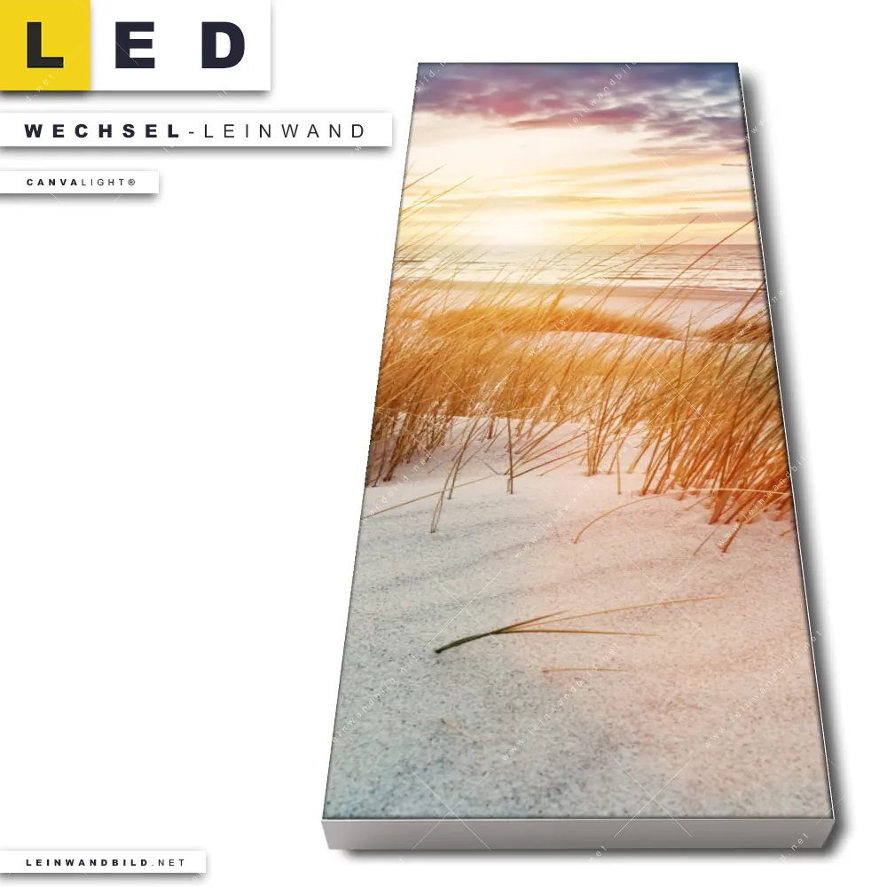 Du konfigurierst Deine individuelle LED Wechsel-Leinwand Canvalight® TEX | Dünen und Meer | Schmal und wir produzieren sie NEU für Dich. Unsere Landschaften, Strand - Meer Austausch-Fotoleinwände für Canvalight® LED Bilder sind KEINE Lagerware. Du bist Dir unsicher, welches Motiv oder Format das richtige für dein individuelles LED Wechselmotiv auf Leinwand ist, dann helfen wir dir gerne weiter und beraten dich!