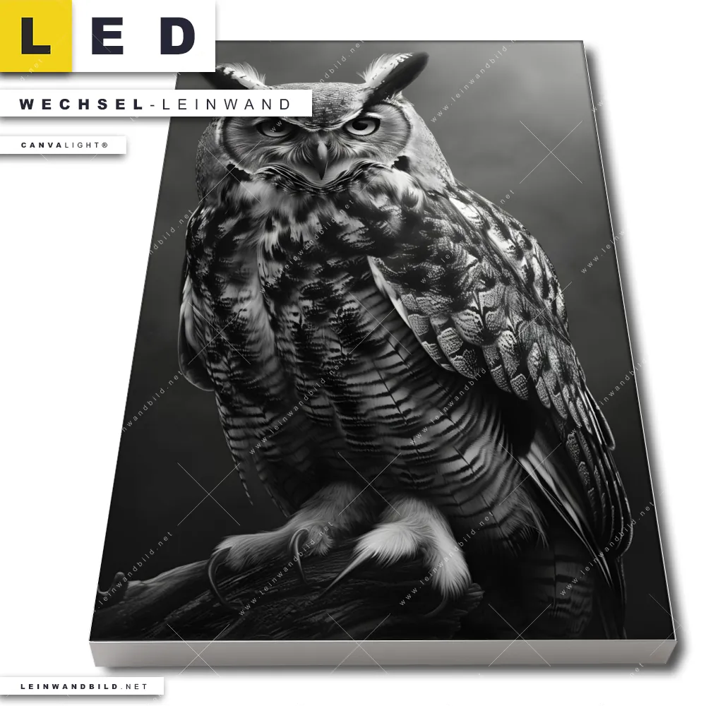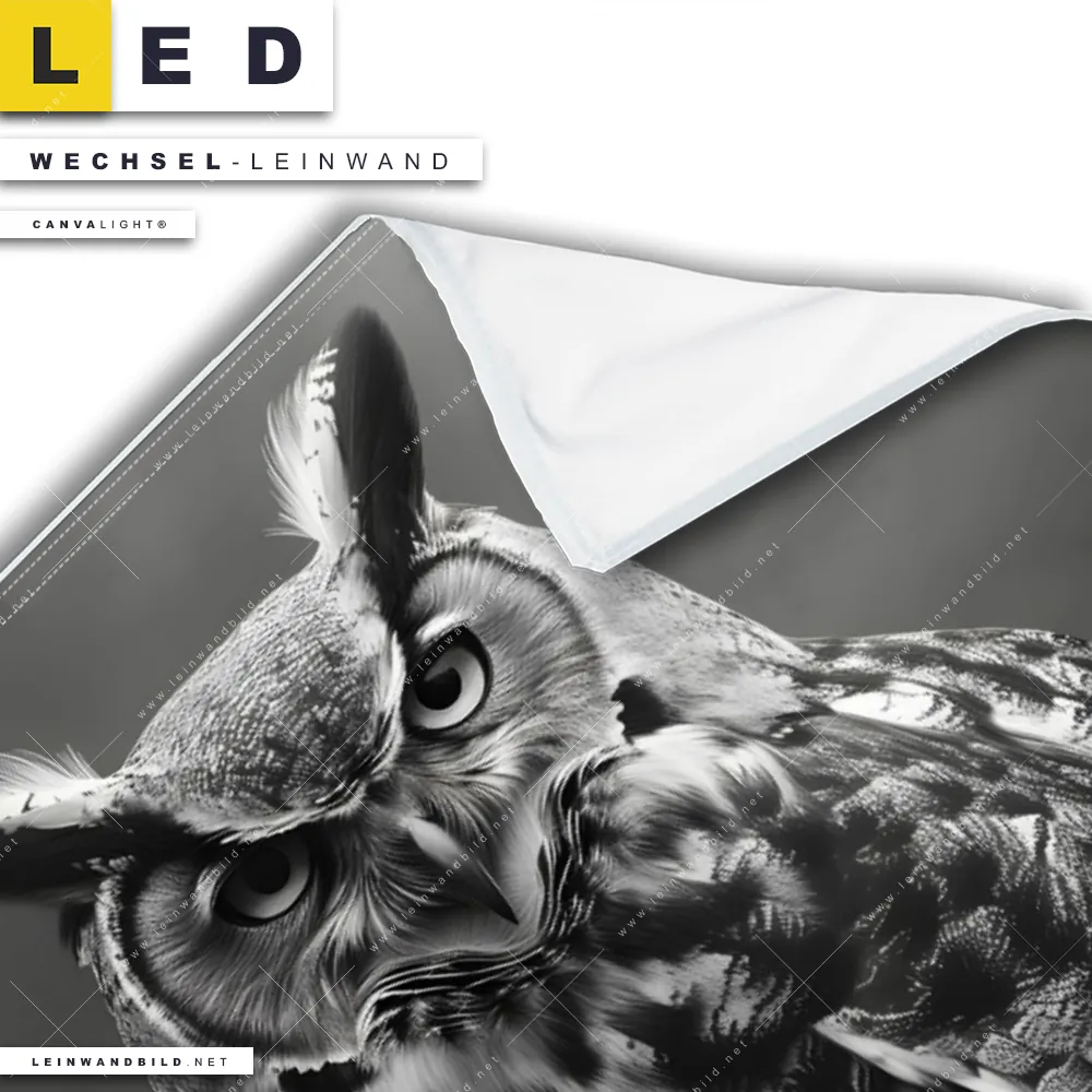 LED Wechsel-Leinwand Canvalight® TEX | Düstere Eleganz der Eule | Hochformat