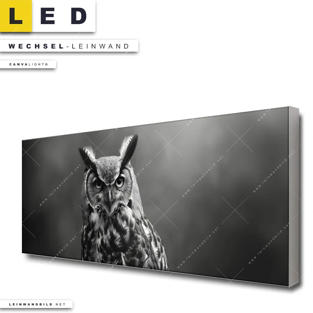 Du bist auf der Suche nach einer Tierwelt Wechsel-Leinwand für Dein LED-Leinwandbild im Panorama-Format? Begriffe wie Tier, Eule, Uhu, Kauz, Vogel, Tierporträt haben Dich auf der Suche nach Deiner Ersatz-Leinwand für dein extra breites LED Wandbild mit wechselbarer Leinwand inspiriert? Farben wie Schwarz, Grau dürfen auf Deinem neuen Wechselmotiv für Dein XXL Leinwand-LED-Bild nicht fehlen und Leinwände im Schwarz - Weiss, Natürlich - Realistisch Stil für Leuchtbilder passen perfekt zu Deinem Einrichtungsstil?