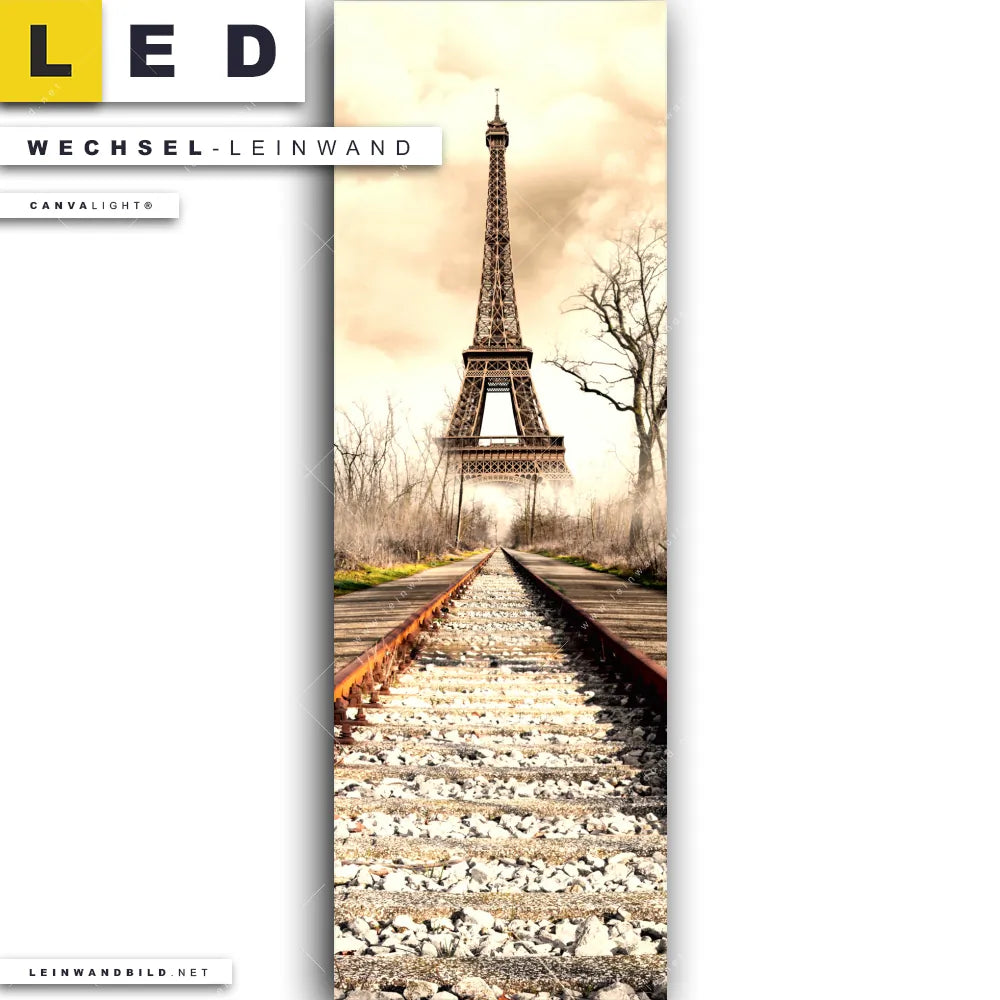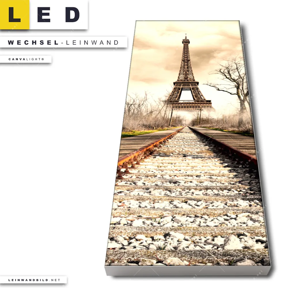 Dann sollte die Wechsel-Leinwand Canvalight® TEX | Eifelturm am Abstellgleis | Schmal den Weg zu Dir finden. Die Austausch-Leinwand Zug zum Eiffelturm - passend für unsere stufenlos dimmbaren, steckerfertigen Leinwandbilder im LED Leuchtrahmen mit Fernbedienung und optionaler Farbtemperatursteuerung - fügt sich als Eye-Catcher harmonisch in jedes Arzt - Praxis, Büro - Kanzlei, Flur - Eingangsbereich, Wohnzimmer - Schlafzimmer Raumkonzept ein.