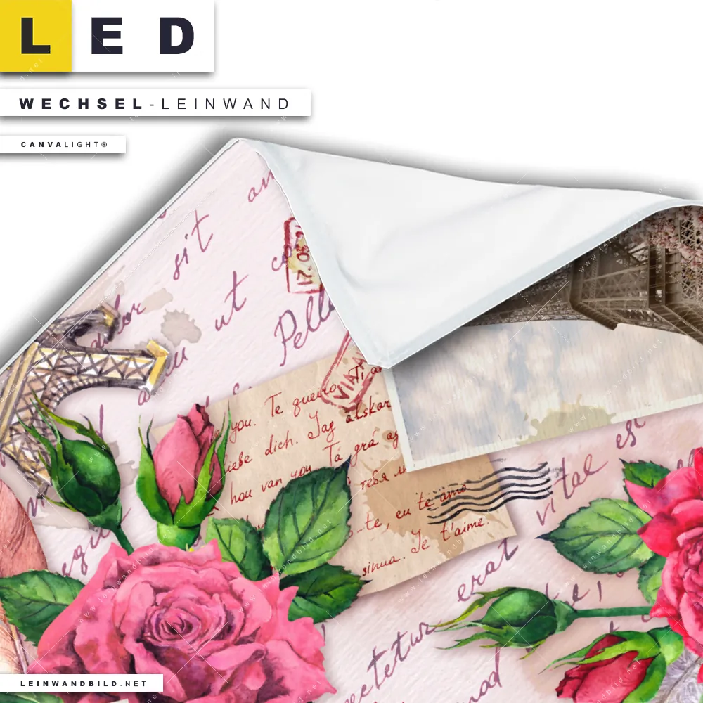 Bitte beachte, dass die Farben, der auf dem Monitor abgebildeten Liebesbriefe aus Paris Darstellung, möglicherweise von den Originalfarben deiner Canvalight® TEX Wechsel-Leinwand abweichen können.