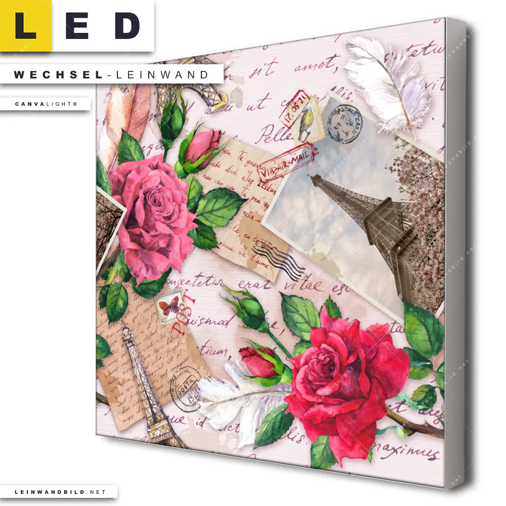 Dann sollte die Wechsel-Leinwand Canvalight® TEX | Eifelturm & Rosen | Quadrat den Weg zu Dir finden. Die Austausch-Leinwand Liebespost - passend für unsere stufenlos dimmbaren, steckerfertigen Leinwandbilder im Leuchtrahmen mit Fernbedienung und optionaler Farbtemperatursteuerung - fügt sich als Eye-Catcher harmonisch in jedes Wohnzimmer - Schlafzimmer, Küche - Esszimmer, Flur - Eingangsbereich, Büro - Kanzlei Raumkonzept ein.