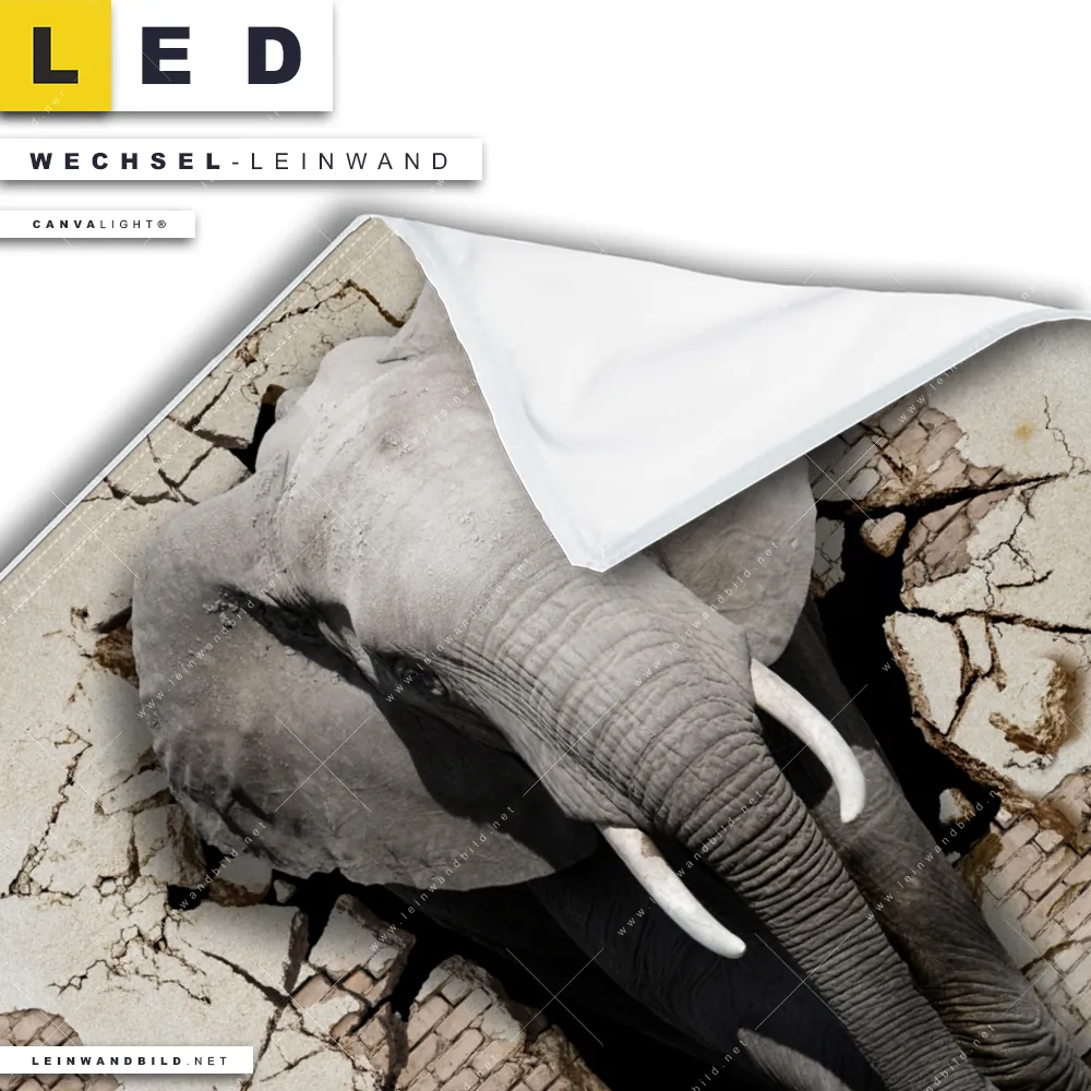 Du konfigurierst Deine individuelle LED Wechsel-Leinwand Canvalight® TEX | Elefant bricht durch Mauer | Quadrat und wir produzieren sie NEU für Dich. Unsere Tierwelt Austausch-Fotoleinwände für Canvalight® LED Bilder sind KEINE Lagerware. Du bist Dir unsicher, welches Motiv oder Format das richtige für dein individuelles LED Wechselmotiv auf Leinwand ist, dann helfen wir dir gerne weiter und beraten dich!