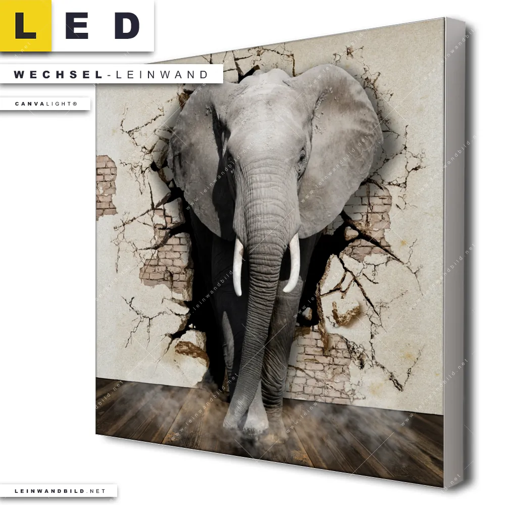Dann sollte die Wechsel-Leinwand Canvalight® TEX | Elefant bricht durch Mauer | Quadrat den Weg zu Dir finden. Die Austausch-Leinwand Elefant durchbricht Wand - passend für unsere stufenlos dimmbaren, steckerfertigen Leinwandbilder im Leuchtrahmen mit Fernbedienung und optionaler Farbtemperatursteuerung - fügt sich als Eye-Catcher harmonisch in jedes Wohnzimmer - Schlafzimmer, Bar - Gastronomie Raumkonzept ein.