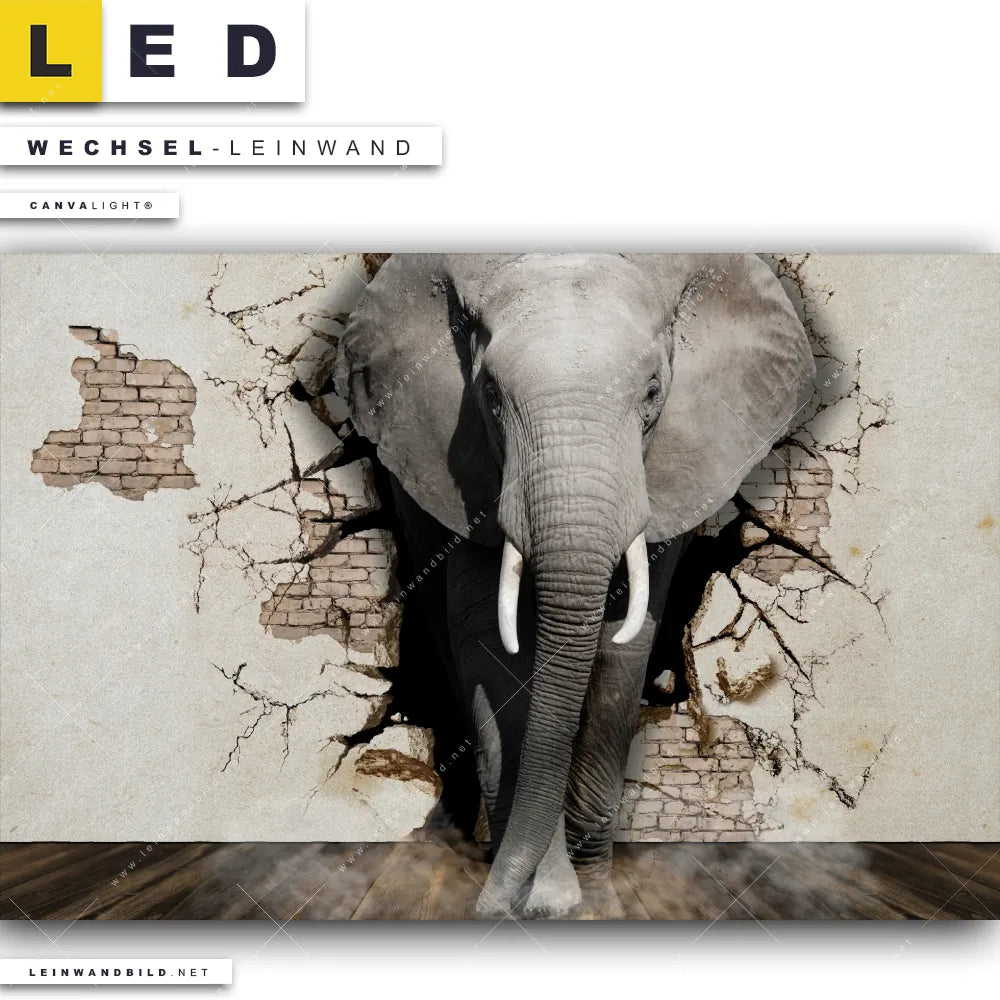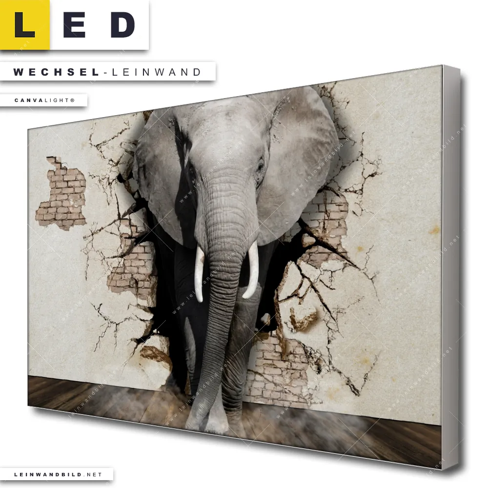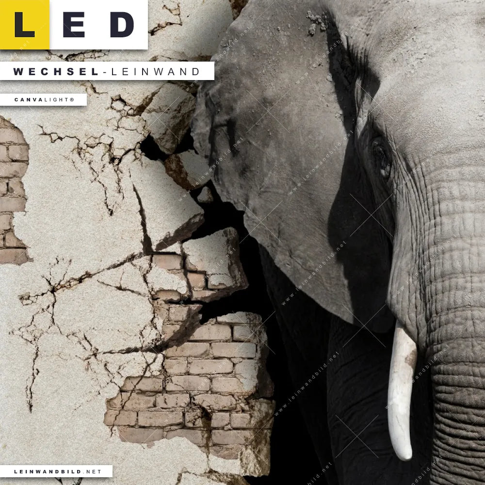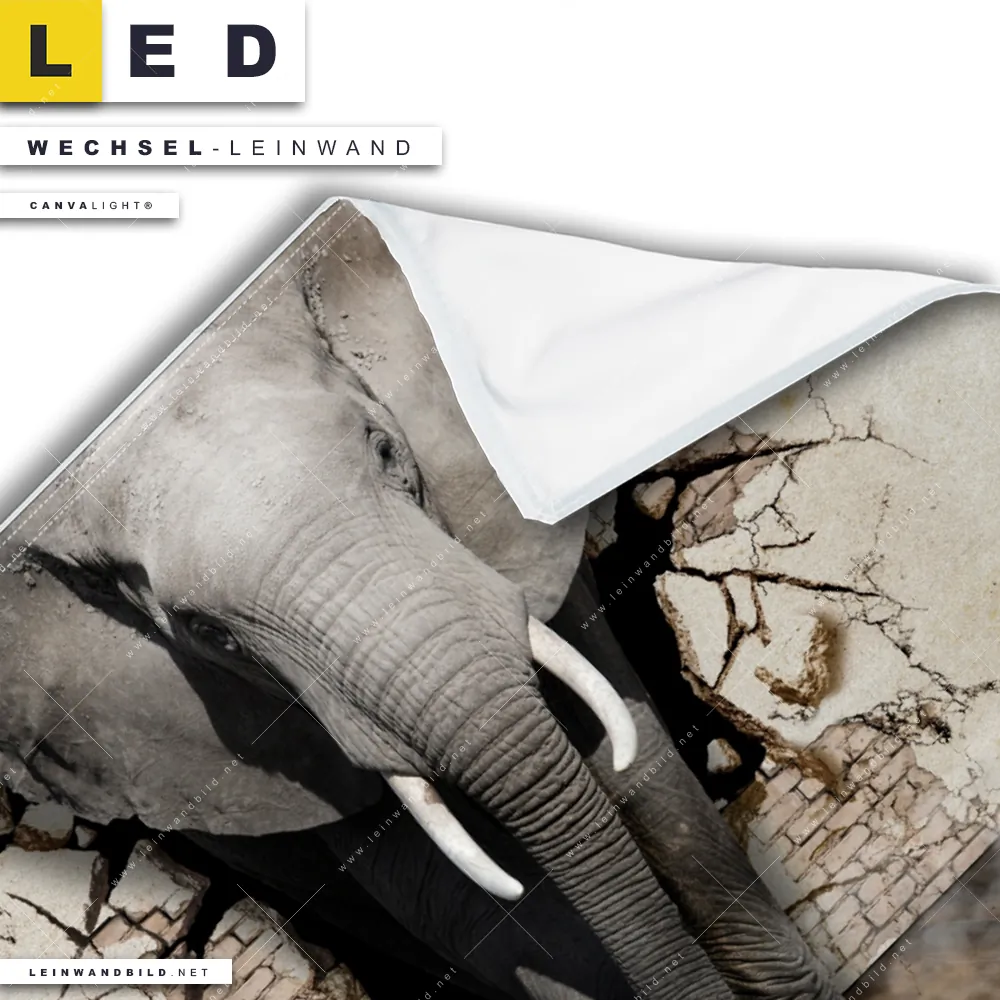 LED Wechsel-Leinwand Canvalight® TEX | Elefant bricht durch Mauer | Querformat
