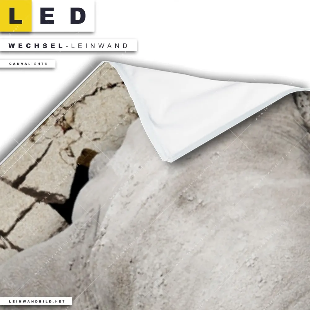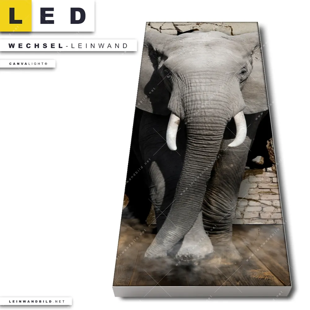 Du konfigurierst Deine individuelle LED Wechsel-Leinwand Canvalight® TEX | Elefant bricht durch Mauer | Schmal und wir produzieren sie NEU für Dich. Unsere Tierwelt Austausch-Fotoleinwände für Canvalight® LED Bilder sind KEINE Lagerware. Du bist Dir unsicher, welches Motiv oder Format das richtige für dein individuelles LED Wechselmotiv auf Leinwand ist, dann helfen wir dir gerne weiter und beraten dich!