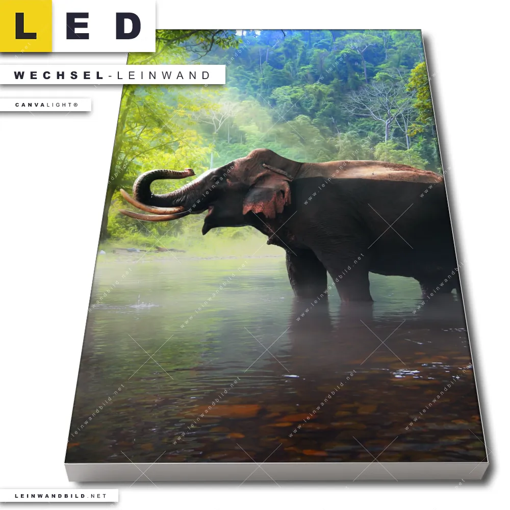 Dann sollte die Wechsel-Leinwand Canvalight® TEX | Elefant im Wasser | Hochformat den Weg zu Dir finden. Die Austausch-Leinwand Elefant in tropischer Umgebung - passend für unsere stufenlos dimmbaren, steckerfertigen Leinwandbilder im Leuchtrahmen mit Fernbedienung und optionaler Farbtemperatursteuerung - fügt sich als Eye-Catcher harmonisch in jedes Wohnzimmer - Schlafzimmer, Bar - Gastronomie, Kinderzimmer, Küche - Esszimmer Raumkonzept ein.