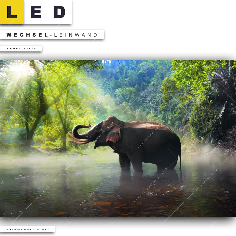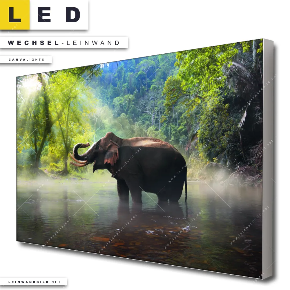 Du bist auf der Suche nach einer Tierwelt Wechsel-Leinwand für Dein LED-Leinwandbild im Querformat? Begriffe wie Elefant, wild, Safari, Dschungel, Wasser, Sonnenstrahlen, Afrika haben Dich auf der Suche nach Deiner Ersatz-Leinwand für dein breites LED Wandbild mit wechselbarer Leinwand inspiriert? Farben wie Grün, Braun dürfen auf Deinem neuen Wechselmotiv für Dein XXL Leinwand-LED-Bild nicht fehlen und Leinwände im Natürlich - Realistisch Stil für Leuchtbilder passen perfekt zu Deinem Einrichtungsstil?