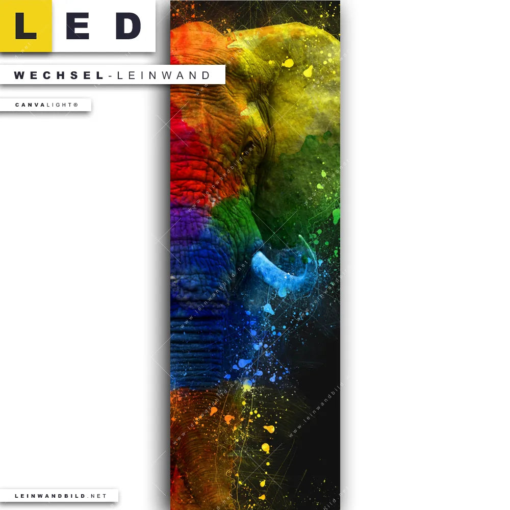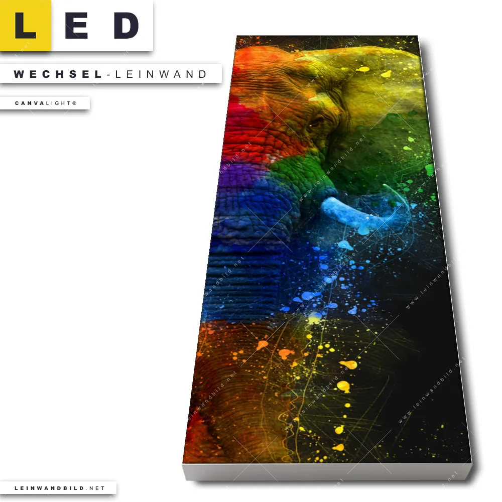 Du bist auf der Suche nach einer Tierwelt Wechsel-Leinwand für Dein LED-Leinwandbild im Schmalen Format? Begriffe wie Pop Art, Kunst, bunt, Tier, Elefant, Afrika, wild, Safari, Farbe, Farbspritzer haben Dich auf der Suche nach Deiner Ersatz-Leinwand für dein LED Wandbild im Panorama-Hochformat mit wechselbarer Leinwand inspiriert? Farben wie Bunt, Schwarz dürfen auf Deinem neuen Wechselmotiv für Dein XXL Leinwand-LED-Bild nicht fehlen und Leinwände im Abstrakt, Pop Art, Modern Art Stil für Leuchtbilder passen perfekt zu Deinem Einrichtungsstil?
