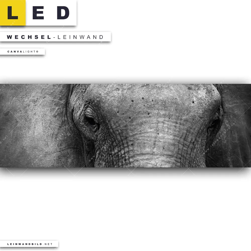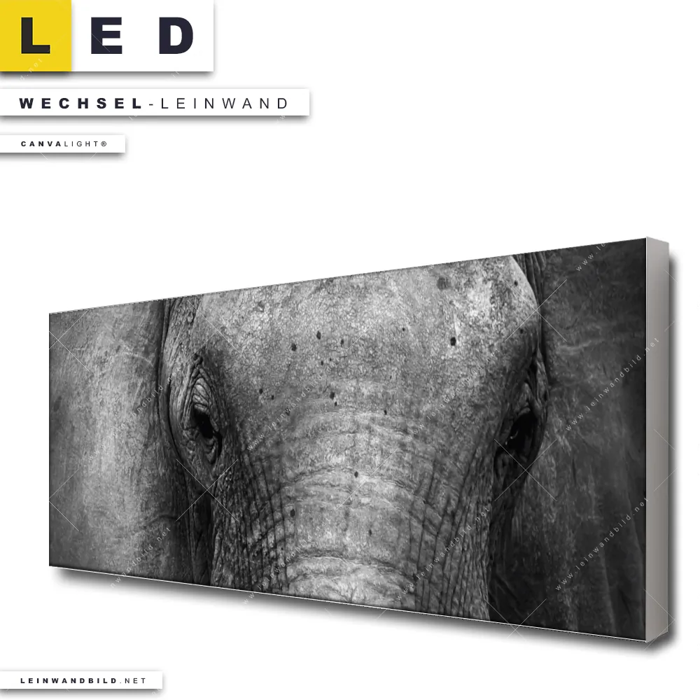 Du bist auf der Suche nach einer Tierwelt Wechsel-Leinwand für Dein LED-Leinwandbild im Panorama-Format? Begriffe wie Afrika, wild, Safari, Tier, Elefant haben Dich auf der Suche nach Deiner Ersatz-Leinwand für dein extra breites LED Wandbild mit wechselbarer Leinwand inspiriert? Farben wie Weiss, Schwarz dürfen auf Deinem neuen Wechselmotiv für Dein XXL Leinwand-LED-Bild nicht fehlen und Leinwände im Natürlich - Realistisch, Schwarz - Weiss Stil für Leuchtbilder passen perfekt zu Deinem Einrichtungsstil?