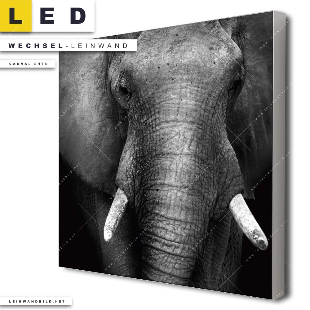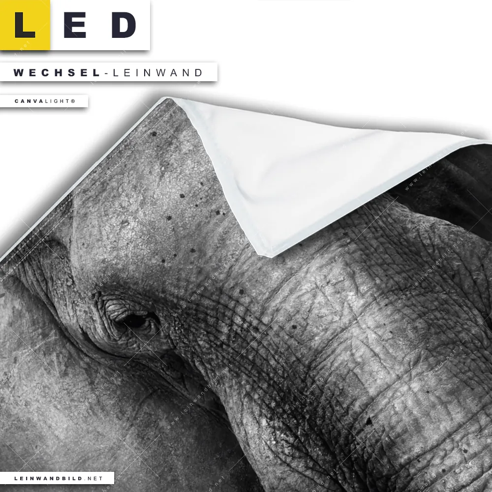 Du bist auf der Suche nach einer Tierwelt Wechsel-Leinwand für Dein LED-Leinwandbild im Quadratischen Format? Begriffe wie Afrika, wild, Safari, Tier, Elefant haben Dich auf der Suche nach Deiner Ersatz-Leinwand für dein LED Wandbild mit wechselbarer Leinwand inspiriert? Farben wie Weiss, Schwarz dürfen auf Deinem neuen Wechselmotiv für Dein XXL Leinwand-LED-Bild nicht fehlen und Leinwände im Natürlich - Realistisch, Schwarz - Weiss Stil für Leuchtbilder passen perfekt zu Deinem Einrichtungsstil?
