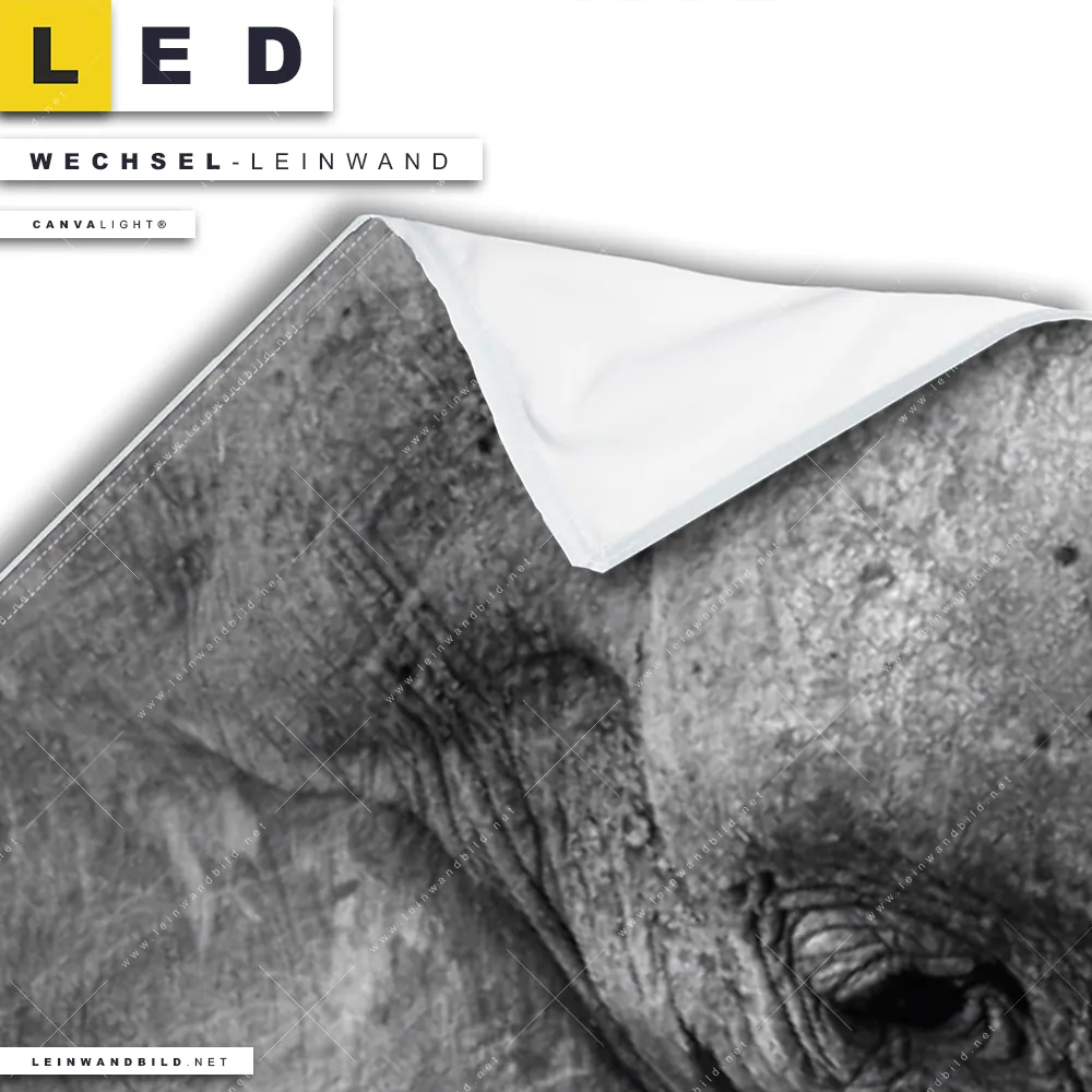 Du konfigurierst Deine individuelle LED Wechsel-Leinwand Canvalight® TEX | Elefant Schwarzweiß | Schmal und wir produzieren sie NEU für Dich. Unsere Tierwelt Austausch-Fotoleinwände für Canvalight® LED Bilder sind KEINE Lagerware. Du bist Dir unsicher, welches Motiv oder Format das richtige für dein individuelles LED Wechselmotiv auf Leinwand ist, dann helfen wir dir gerne weiter und beraten dich!
