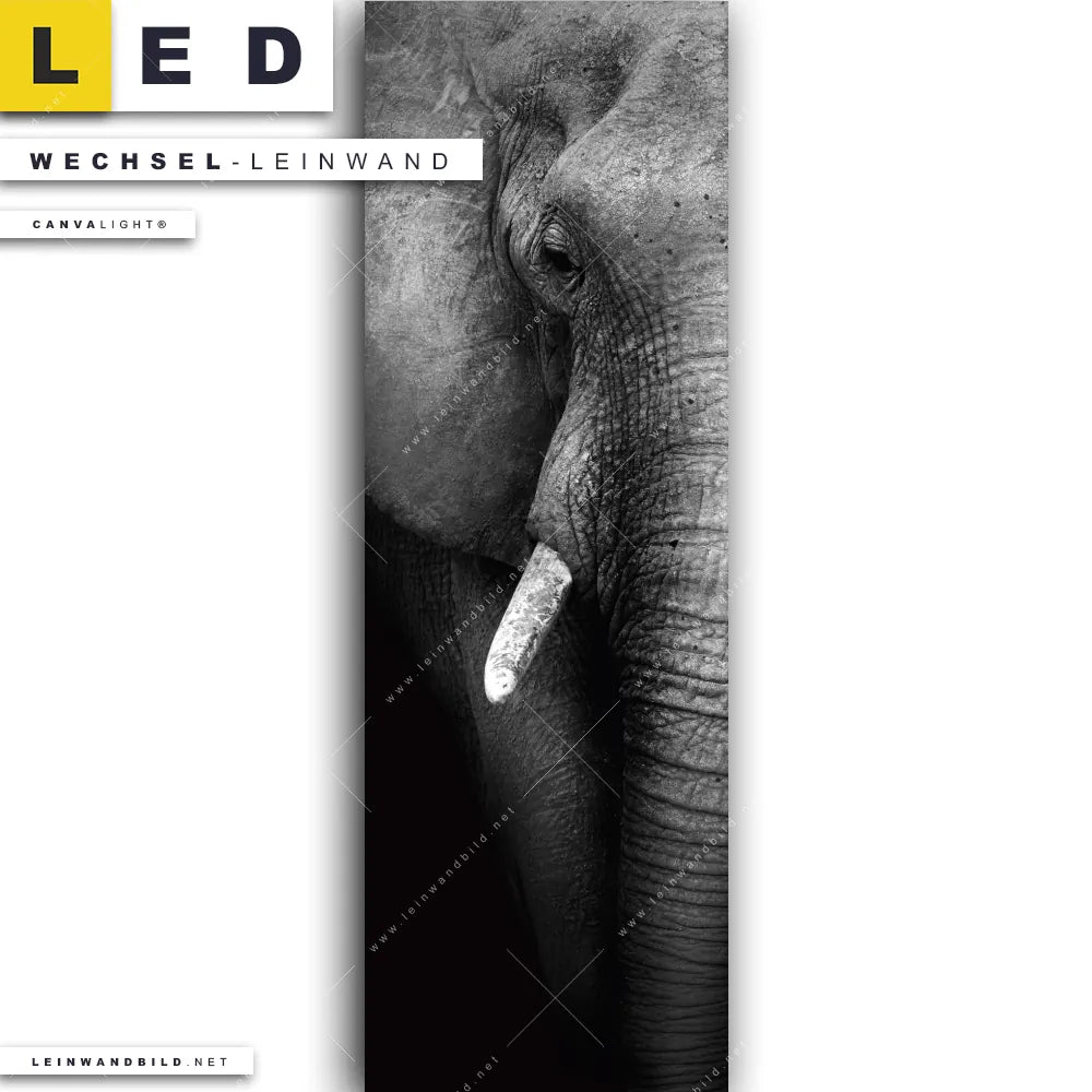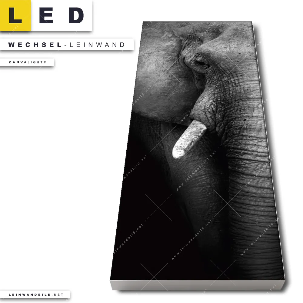 Du bist auf der Suche nach einer Tierwelt Wechsel-Leinwand für Dein LED-Leinwandbild im Schmalen Format? Begriffe wie Afrika, wild, Safari, Tier, Elefant haben Dich auf der Suche nach Deiner Ersatz-Leinwand für dein LED Wandbild im Panorama-Hochformat mit wechselbarer Leinwand inspiriert? Farben wie Weiss, Schwarz dürfen auf Deinem neuen Wechselmotiv für Dein XXL Leinwand-LED-Bild nicht fehlen und Leinwände im Natürlich - Realistisch, Schwarz - Weiss Stil für Leuchtbilder passen perfekt zu Deinem Einrichtungsstil?