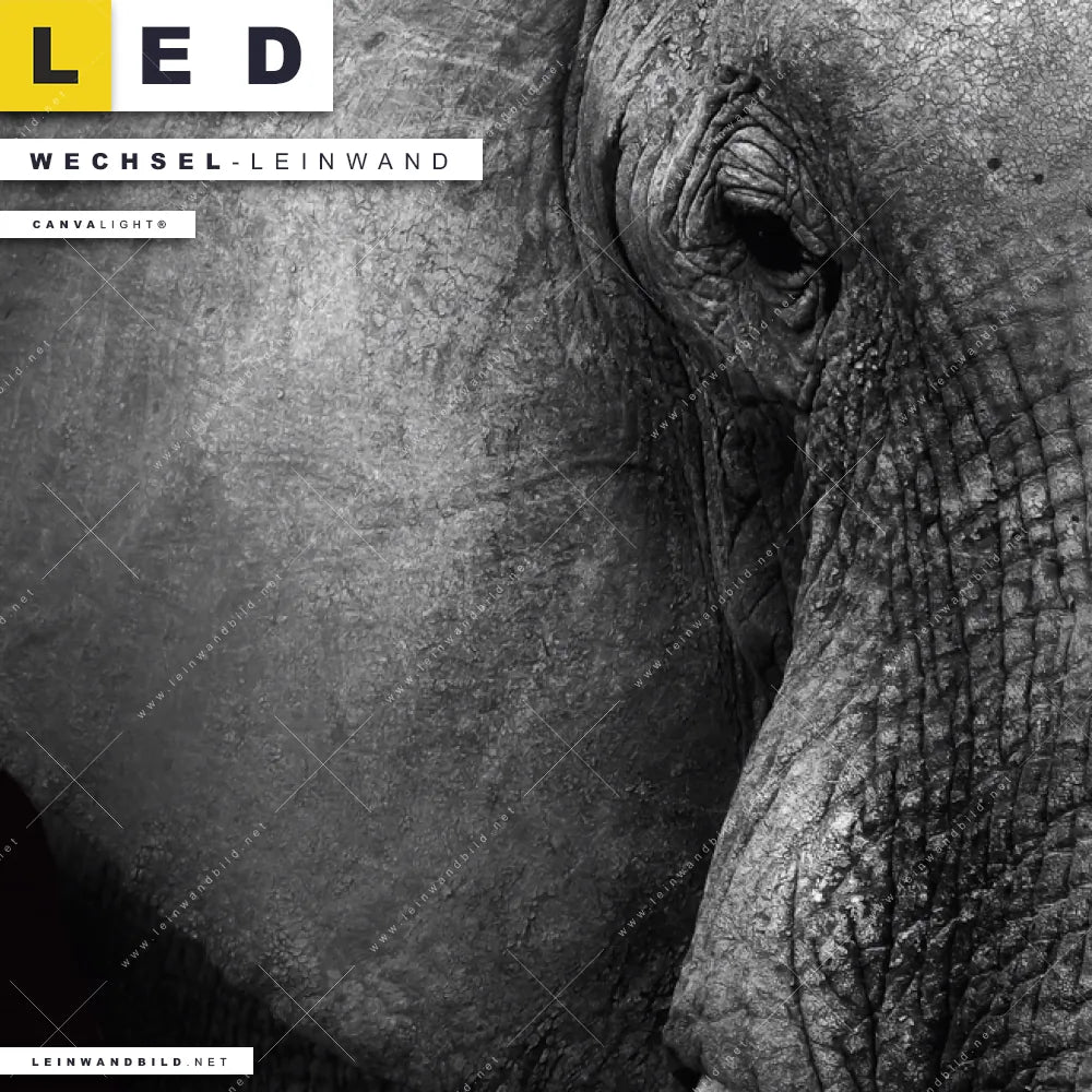 Dann sollte die Wechsel-Leinwand Canvalight® TEX | Elefant Schwarzweiß | Schmal den Weg zu Dir finden. Die Austausch-Leinwand Nahaufnahme Elefant - passend für unsere stufenlos dimmbaren, steckerfertigen Leinwandbilder im LED Leuchtrahmen mit Fernbedienung und optionaler Farbtemperatursteuerung - fügt sich als Eye-Catcher harmonisch in jedes Arzt - Praxis, Bar - Gastronomie, Büro - Kanzlei, Wohnzimmer - Schlafzimmer Raumkonzept ein.