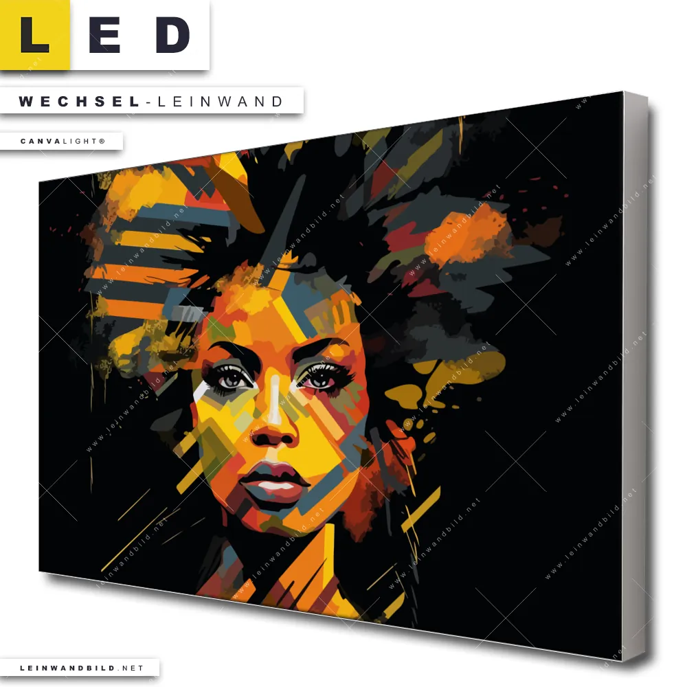 Dann sollte die Wechsel-Leinwand Canvalight® TEX | Erzörnte Frau | Querformat den Weg zu Dir finden. Die Austausch-Leinwand abstraktes Frauenporträt - passend für unsere stufenlos dimmbaren, steckerfertigen Leinwandbilder im Leuchtrahmen mit Fernbedienung und optionaler Farbtemperatursteuerung - fügt sich als Eye-Catcher harmonisch in jedes Wohnzimmer - Schlafzimmer, Bar - Gastronomie, Friseur - Beauty Raumkonzept ein.