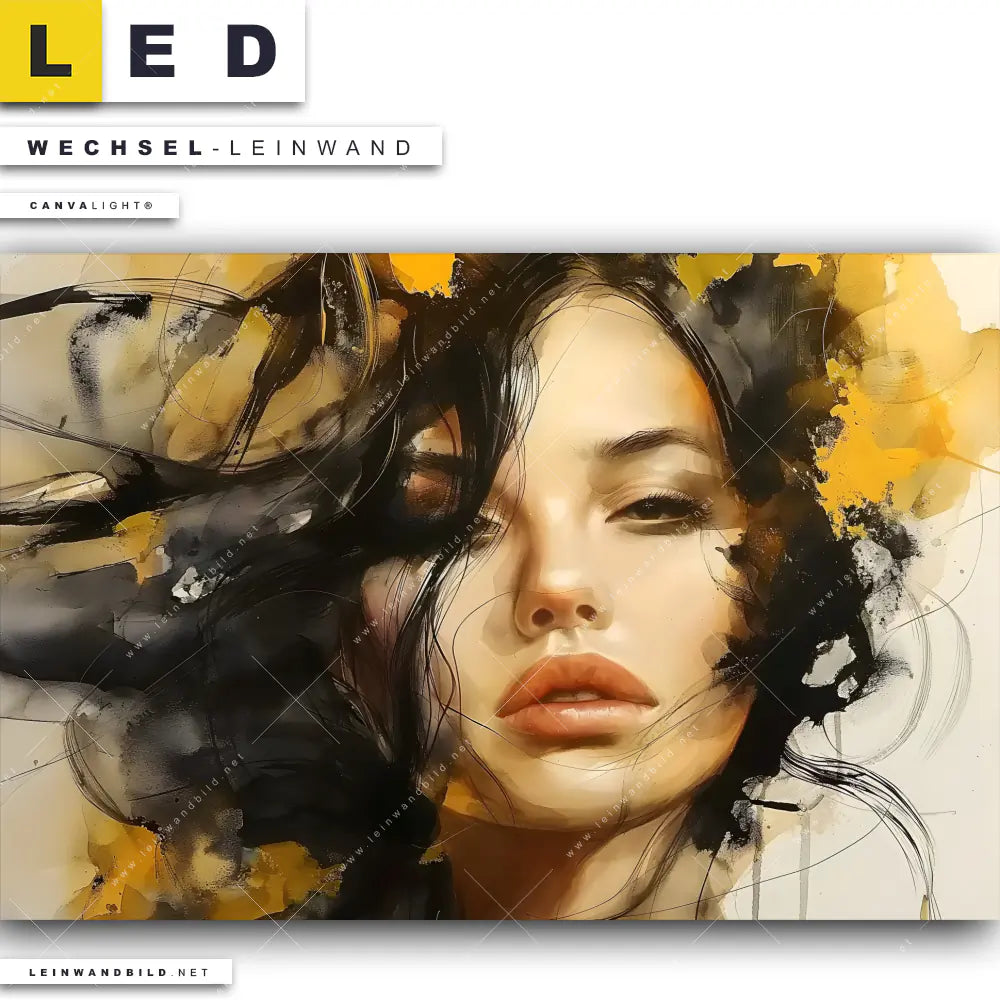 Du bist auf der Suche nach einer Porträts - Menschen Wechsel-Leinwand für Dein LED-Leinwandbild im Querformat? Begriffe wie Abstrakt, Modern, Kunst, Gemälde, Ölfarbe, Frau, Portrait, Lippen, Aquarell, Farbspritzer haben Dich auf der Suche nach Deiner Ersatz-Leinwand für dein breites LED Wandbild mit wechselbarer Leinwand inspiriert? Farben wie Schwarz, Beige, Orange, Ocker, Gelb dürfen auf Deinem neuen Wechselmotiv für Dein XXL Leinwand-LED-Bild nicht fehlen und Leinwände im Abstrakt, Modern Art Stil für Leuchtbilder passen perfekt zu Deinem Einrichtungsstil?