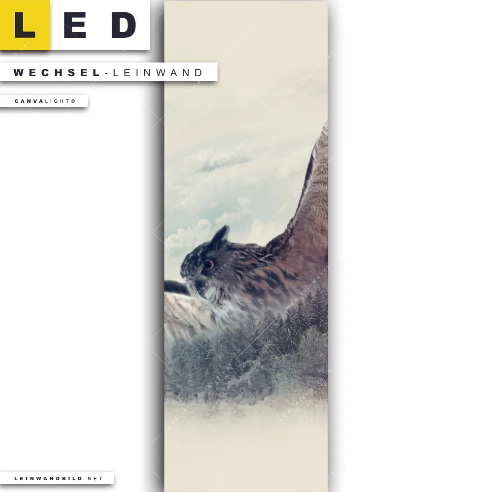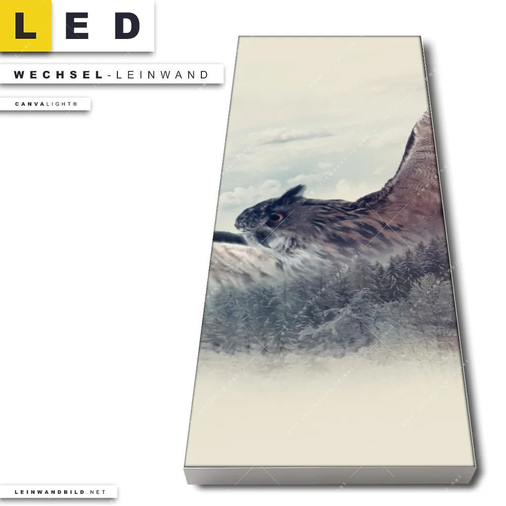 Du konfigurierst Deine individuelle LED Wechsel-Leinwand Canvalight® TEX | Eule & Wald No.2 | Schmal und wir produzieren sie NEU für Dich. Unsere Tierwelt Austausch-Fotoleinwände für Canvalight® LED Bilder sind KEINE Lagerware. Du bist Dir unsicher, welches Motiv oder Format das richtige für dein individuelles LED Wechselmotiv auf Leinwand ist, dann helfen wir dir gerne weiter und beraten dich!