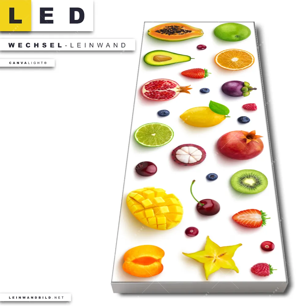 Du bist auf der Suche nach einer Essen - Trinken Wechsel-Leinwand für Dein LED-Leinwandbild im Schmalen Format? Begriffe wie Obst, Zitrusfrüchte, Früchte, Kiwi, frisch, spritzig, Ananas, Spritzer, Tropfen, Orange, Apfel, Zitrone, Granadapfel, Blaubeere haben Dich auf der Suche nach Deiner Ersatz-Leinwand für dein LED Wandbild im Panorama-Hochformat mit wechselbarer Leinwand inspiriert? Farben wie Bunt, Weiss, Blau, Grün, Mint, Orange, Rot, Rosa dürfen auf Deinem neuen Wechselmotiv für Dein XXL Leinwand-LED-Bild nicht fehlen und Leinwände im Mixed Media, Modern Art Stil für Leuchtbilder passen perfekt zu Deinem Einrichtungsstil?
