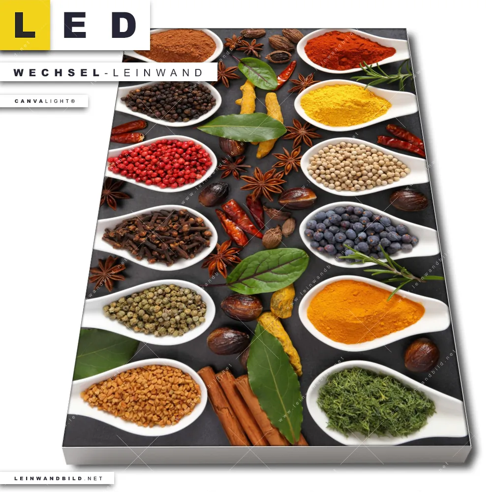 Du bist auf der Suche nach einer Essen - Trinken Wechsel-Leinwand für Dein LED-Leinwandbild im Hochformat? Begriffe wie Gewürze, Kräuter, Löffel, Besteck, Lebensmittel, Geschmack, Indien haben Dich auf der Suche nach Deiner Ersatz-Leinwand für dein LED Wandbild mit wechselbarer Leinwand inspiriert? Farben wie Bunt, Weiss, Blau, Braun, Beige, Gelb , Grün, Lila, Ocker, Orange, Rot, Rosa dürfen auf Deinem neuen Wechselmotiv für Dein XXL Leinwand-LED-Bild nicht fehlen und Leinwände im Natürlich - Realistisch Stil für Leuchtbilder passen perfekt zu Deinem Einrichtungsstil?