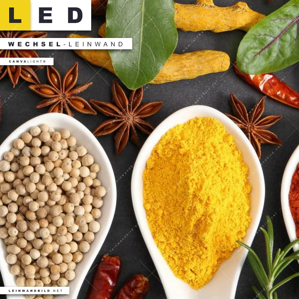 Du bist auf der Suche nach einer Essen - Trinken Wechsel-Leinwand für Dein LED-Leinwandbild im Querformat? Begriffe wie Gewürze, Kräuter, Löffel, Besteck, Lebensmittel, Geschmack, Indien haben Dich auf der Suche nach Deiner Ersatz-Leinwand für dein breites LED Wandbild mit wechselbarer Leinwand inspiriert? Farben wie Bunt, Weiss, Blau, Braun, Beige, Gelb , Grün, Lila, Ocker, Orange, Rot, Rosa dürfen auf Deinem neuen Wechselmotiv für Dein XXL Leinwand-LED-Bild nicht fehlen und Leinwände im Natürlich - Realistisch Stil für Leuchtbilder passen perfekt zu Deinem Einrichtungsstil?