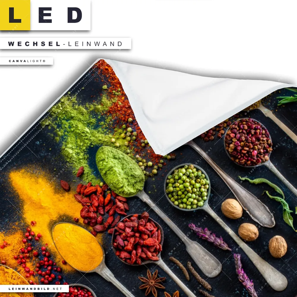 Du konfigurierst Deine individuelle LED Wechsel-Leinwand Canvalight® TEX | Exotische Gewürze auf Löffeln | Querformat und wir produzieren sie NEU für Dich. Unsere Essen - Trinken Austausch-Fotoleinwände für Canvalight® LED Bilder sind KEINE Lagerware. Du bist Dir unsicher, welches Motiv oder Format das richtige für dein individuelles LED Wechselmotiv auf Leinwand ist, dann helfen wir dir gerne weiter und beraten dich!