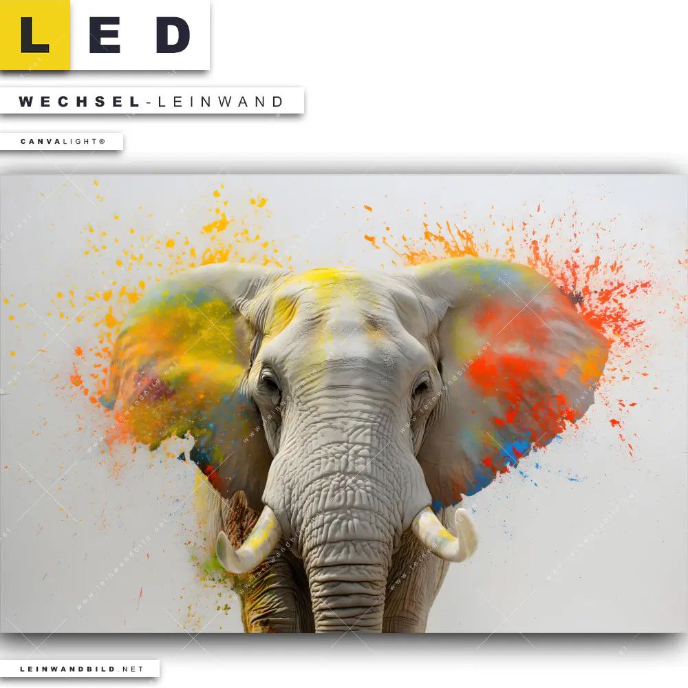 LED Wechsel-Leinwand Canvalight® TEX | Farbenexplosion mit Elefant | Querformat