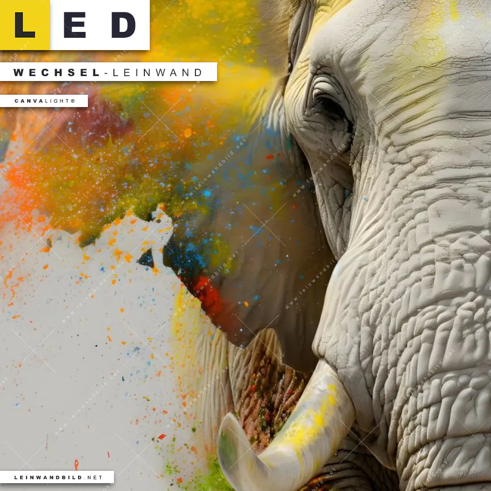 Du bist auf der Suche nach einer Tierwelt Wechsel-Leinwand für Dein LED-Leinwandbild im Schmalen Format? Begriffe wie Elefant, Afrika, Big Five, Dickhäuter, Stoßzahn, Farbspritzer, Farbwolke, Dschungel haben Dich auf der Suche nach Deiner Ersatz-Leinwand für dein LED Wandbild im Panorama-Hochformat mit wechselbarer Leinwand inspiriert? Farben wie Beige, Grau , Orange, Gelb dürfen auf Deinem neuen Wechselmotiv für Dein XXL Leinwand-LED-Bild nicht fehlen und Leinwände im Pop Art, Modern Art Stil für Leuchtbilder passen perfekt zu Deinem Einrichtungsstil?