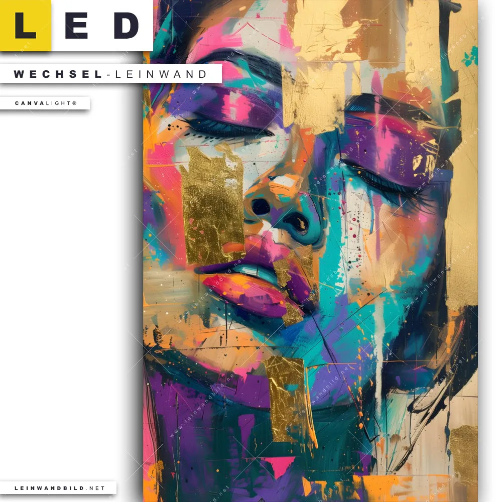 Du bist auf der Suche nach einer Porträts - Menschen Wechsel-Leinwand für Dein LED-Leinwandbild im Hochformat? Begriffe wie Farbexplosion, Farbspritzer, Frauenporträt, Frau, Gesicht, Porträt haben Dich auf der Suche nach Deiner Ersatz-Leinwand für dein LED Wandbild mit wechselbarer Leinwand inspiriert? Farben wie Orange, Pink, Lila, Gold dürfen auf Deinem neuen Wechselmotiv für Dein XXL Leinwand-LED-Bild nicht fehlen und Leinwände im Abstrakt, Modern Art Stil für Leuchtbilder passen perfekt zu Deinem Einrichtungsstil?