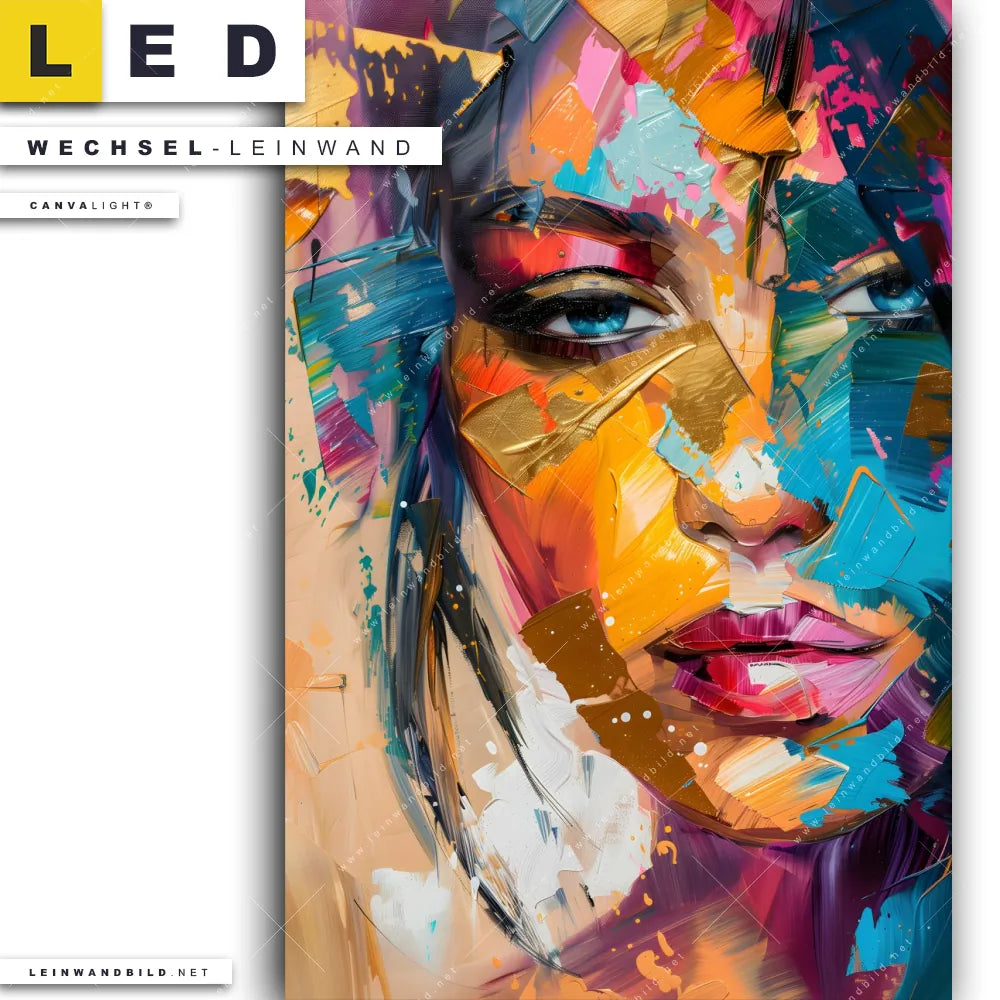 Dann sollte die Wechsel-Leinwand Canvalight® TEX | Farbexplosion - Porträt Lola | Hochformat den Weg zu Dir finden. Die Austausch-Leinwand Künstlerische Darstellung eines Gesichtes - passend für unsere stufenlos dimmbaren, steckerfertigen Leinwandbilder im Leuchtrahmen mit Fernbedienung und optionaler Farbtemperatursteuerung - fügt sich als Eye-Catcher harmonisch in jedes Friseur - Beauty, Wohnzimmer - Schlafzimmer, Flur - Eingangsbereich Raumkonzept ein.