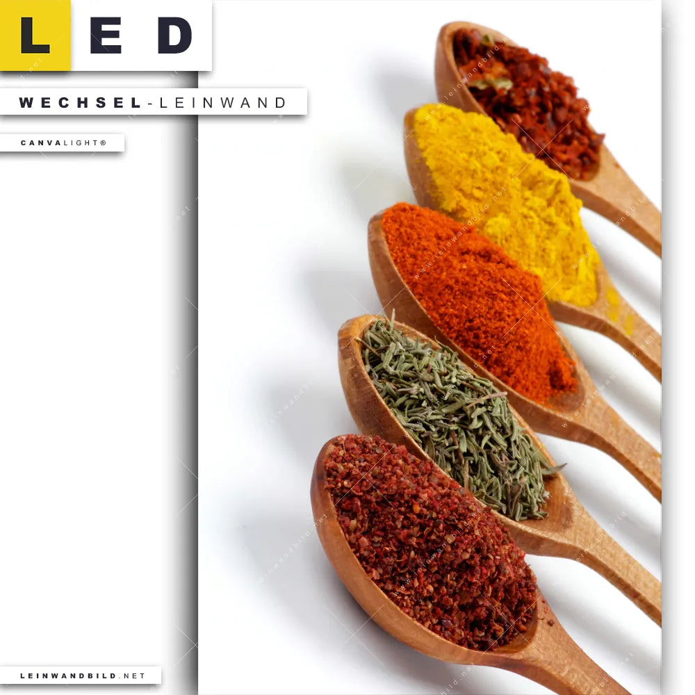 Auf der Suche nach Deinem neuen Wechselmotiv für LED Bilder mit austauschbarer Textil-Leinwand haben Dich Begriffe wie Holzlöffel, Gewürze, Paprika, Curry, Chili, Thymian, Küche inspiriert? Dann sollte die Wechsel-Leinwand Exotische Gewürze auf Löffeln für Canvalight® TEX LED Leuchtbilder den Weg zu Dir finden.