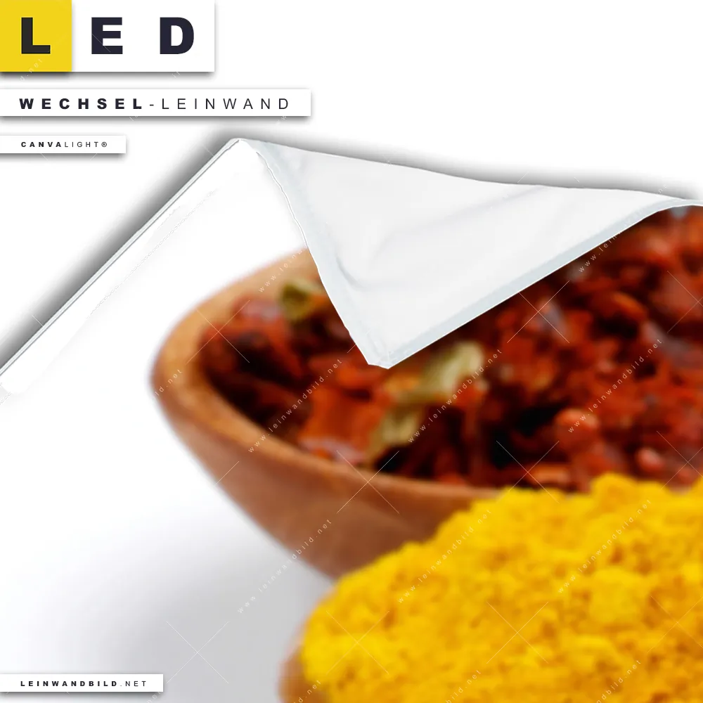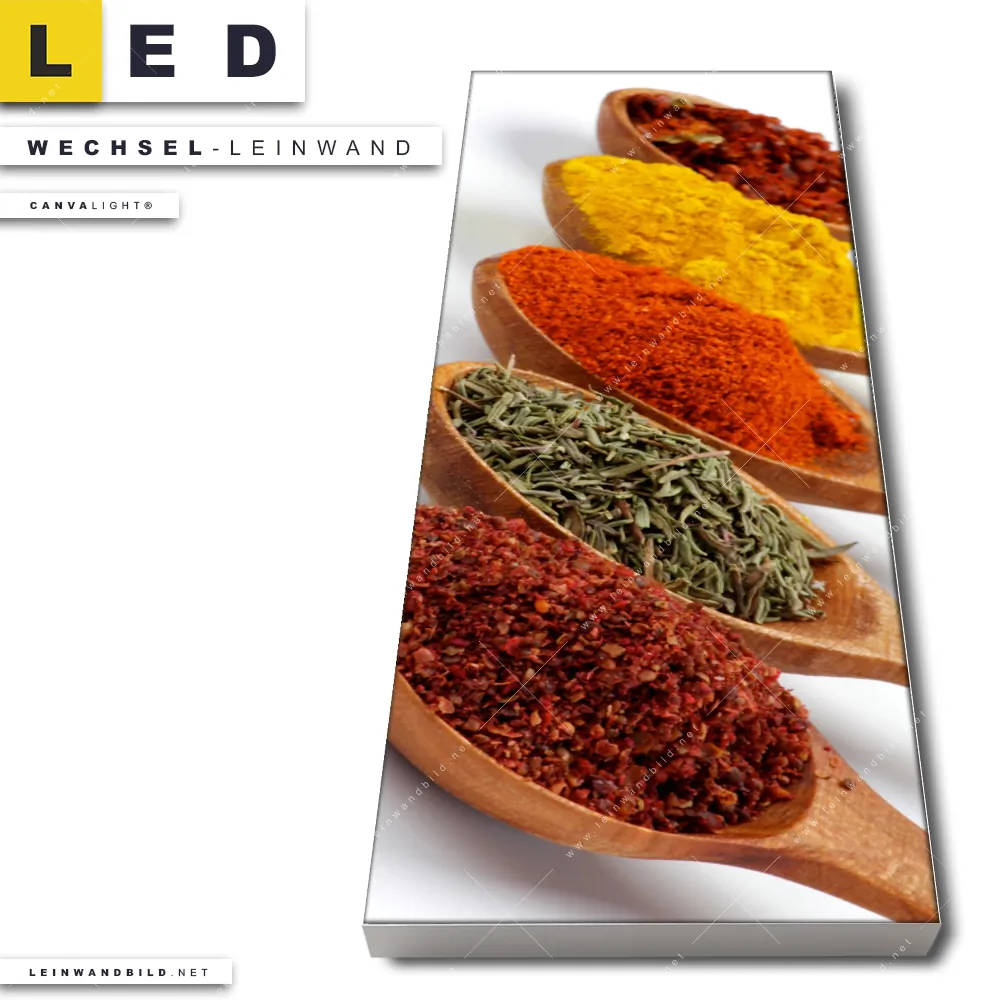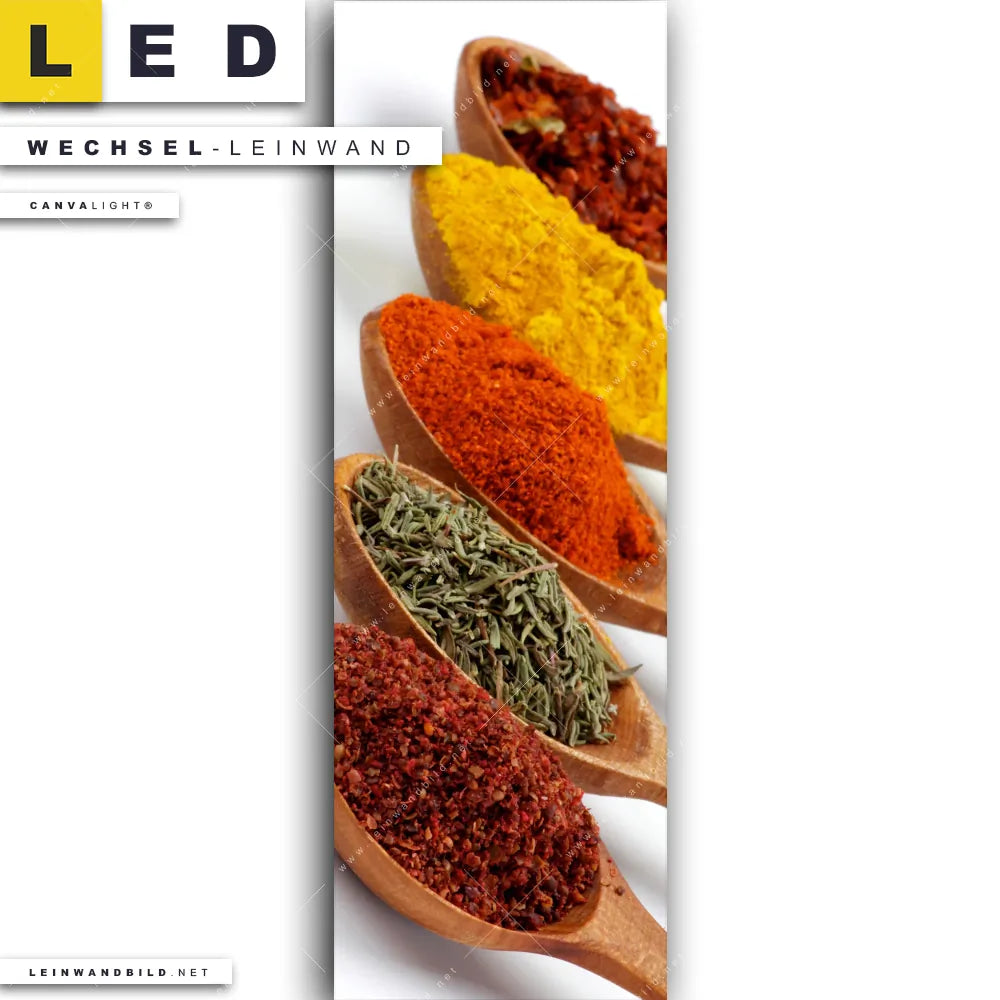 LED Wechsel-Leinwand Canvalight® TEX | Farbige Gewürze auf Holzlöffel | Schmal