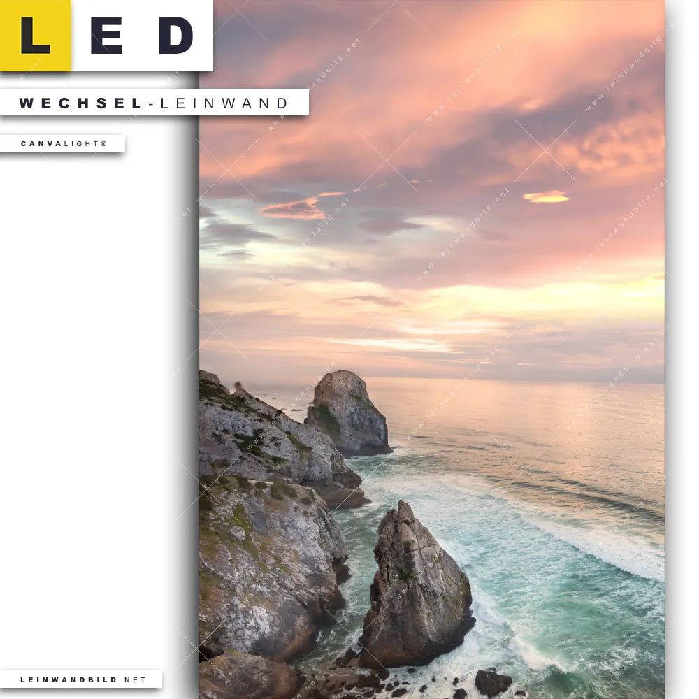 LED Wechsel-Leinwand Canvalight® TEX | Felsen am Meer | Hochformat