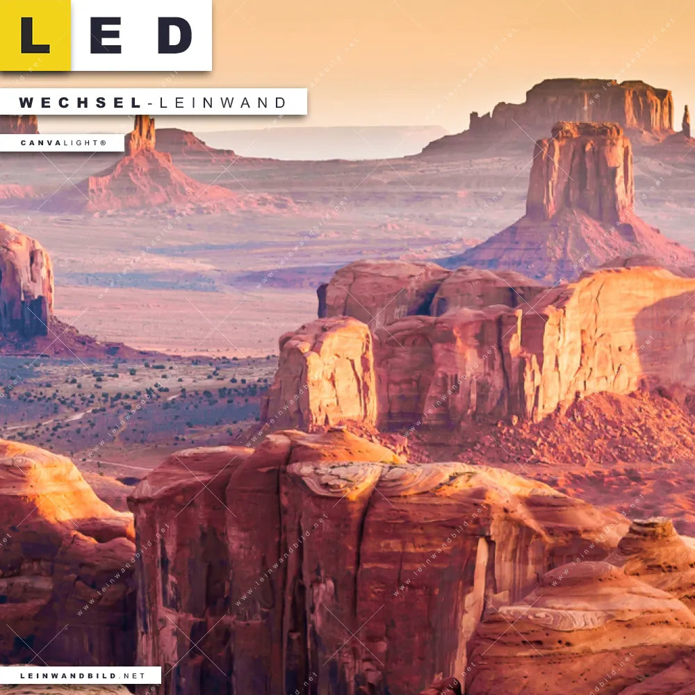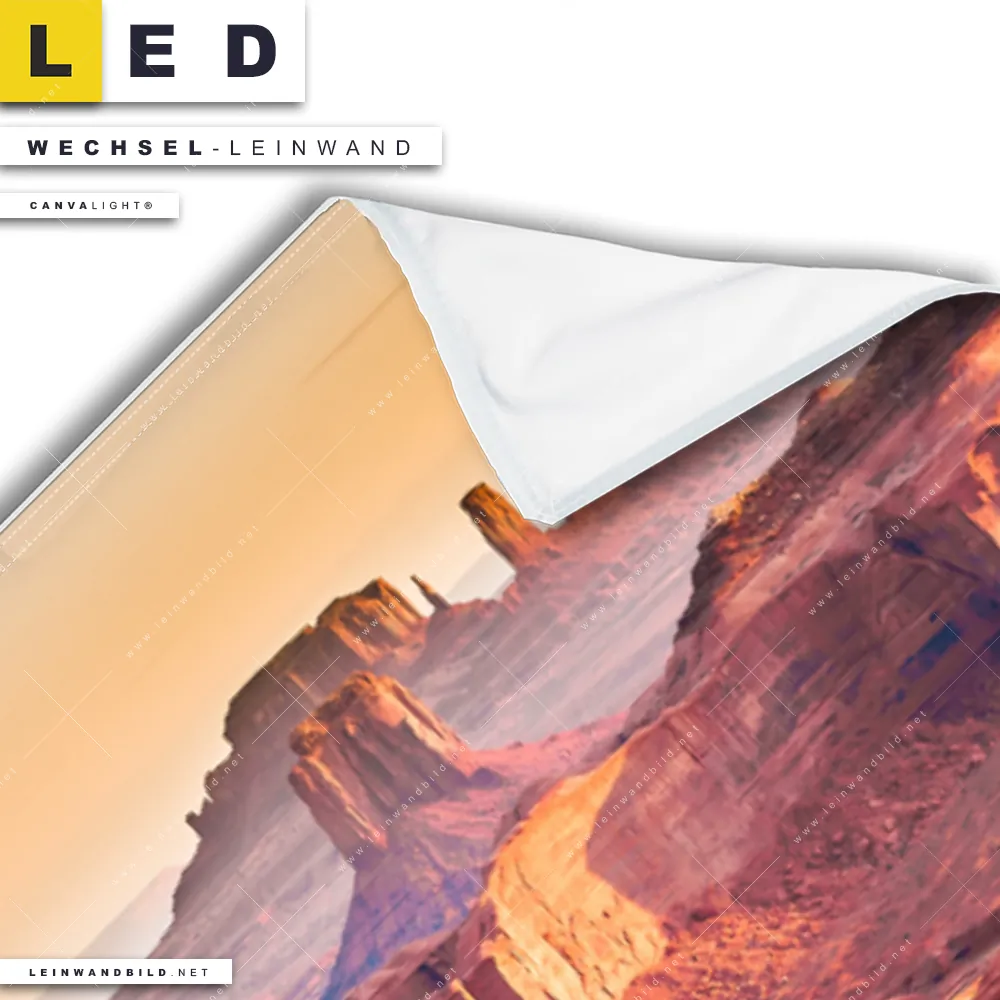 Dann sollte die Wechsel-Leinwand Canvalight® TEX | Felsen bei Sonnenuntergang | Panorama den Weg zu Dir finden. Die Austausch-Leinwand Felsplateau im Navajo Tribal Park - passend für unsere stufenlos dimmbaren, steckerfertigen Leinwandbilder im LED Leuchtrahmen mit Fernbedienung und optionaler Farbtemperatursteuerung - fügt sich als Eye-Catcher harmonisch in jedes Arzt - Praxis, Bar - Gastronomie, Büro - Kanzlei, Flur - Eingangsbereich, Wohnzimmer - Schlafzimmer Raumkonzept ein.