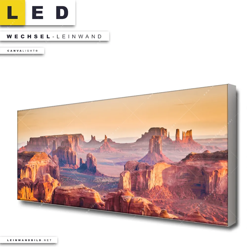 Du bist auf der Suche nach einer Landschaften Wechsel-Leinwand für Dein LED-Leinwandbild im Panorama-Format? Begriffe wie Sehenswürdigkeit, USA, Landschaft, Sonnenuntergang, Steine haben Dich auf der Suche nach Deiner Ersatz-Leinwand für dein extra breites LED Wandbild mit wechselbarer Leinwand inspiriert? Farben wie Orange, Lila, Rot, Rosa, Blau, Grün dürfen auf Deinem neuen Wechselmotiv für Dein XXL Leinwand-LED-Bild nicht fehlen und Leinwände im Natürlich - Realistisch Stil für Leuchtbilder passen perfekt zu Deinem Einrichtungsstil?