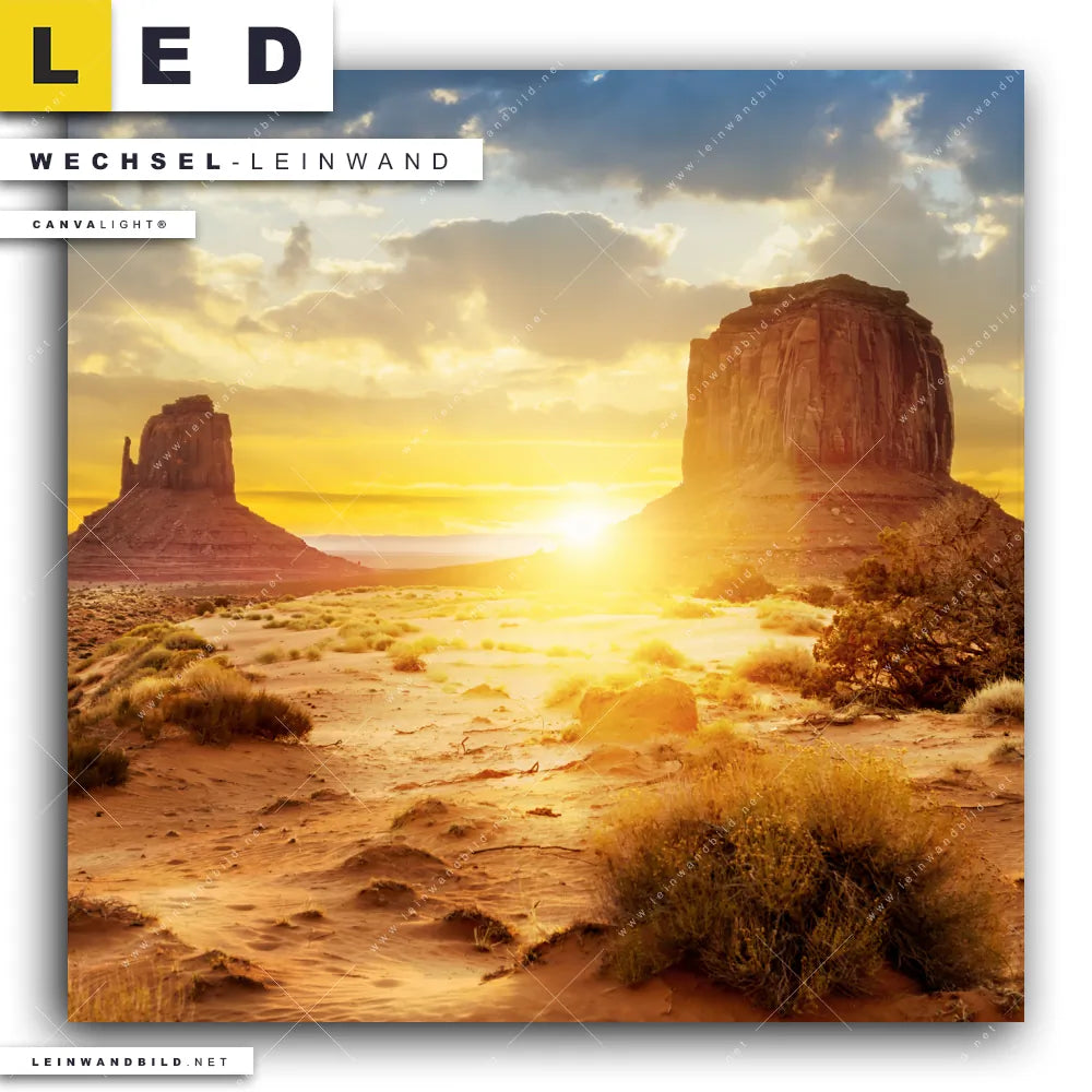 Dann sollte die Wechsel-Leinwand Canvalight® TEX | Felsen in Wüste | Quadrat den Weg zu Dir finden. Die Austausch-Leinwand Monument Valley Felsen in der Abendsonne - passend für unsere stufenlos dimmbaren, steckerfertigen Leinwandbilder im Leuchtrahmen mit Fernbedienung und optionaler Farbtemperatursteuerung - fügt sich als Eye-Catcher harmonisch in jedes Arzt - Praxis, Bar - Gastronomie, Büro - Kanzlei, Flur - Eingangsbereich, Wohnzimmer - Schlafzimmer Raumkonzept ein.