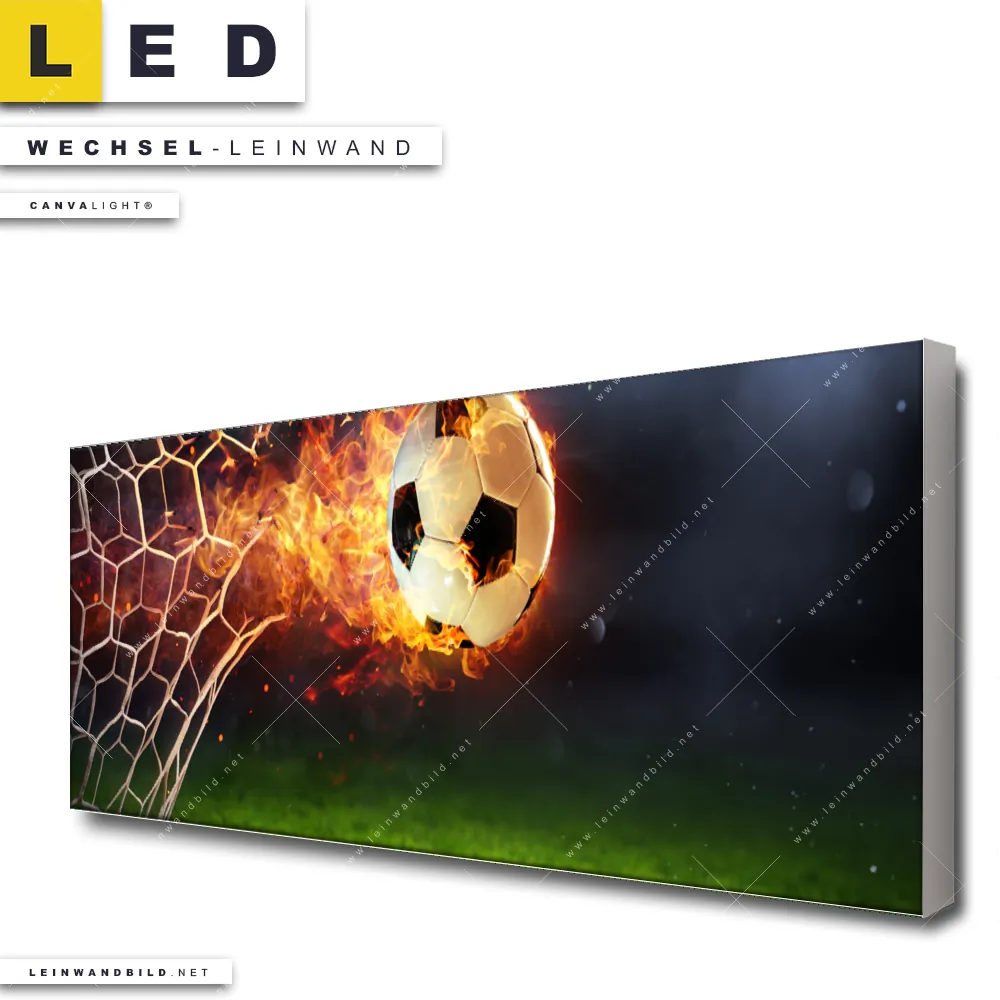 Du bist auf der Suche nach einer Sport - Freizeit Wechsel-Leinwand für Dein LED-Leinwandbild im Panorama-Format? Begriffe wie Sport, Fussball, Tor, Spielfeld, Ball, Torschuss, Netz, Meiserschaft, Feuer, Flammen, brennend haben Dich auf der Suche nach Deiner Ersatz-Leinwand für dein extra breites LED Wandbild mit wechselbarer Leinwand inspiriert? Farben wie Grün, Blau, Orange, Weiss, Schwarz dürfen auf Deinem neuen Wechselmotiv für Dein XXL Leinwand-LED-Bild nicht fehlen und Leinwände im Modern Art, Natürlich - Realistisch Stil für Leuchtbilder passen perfekt zu Deinem Einrichtungsstil?