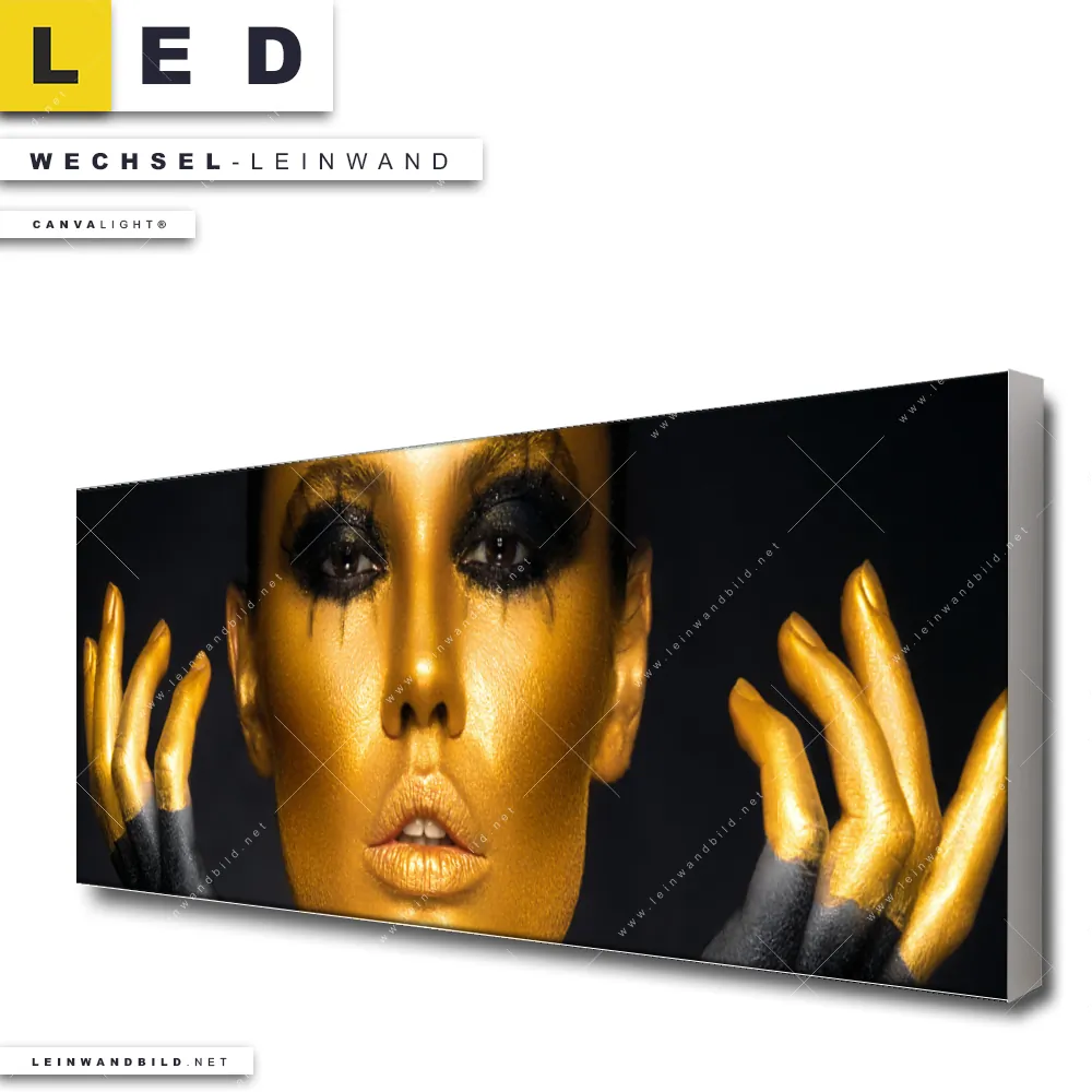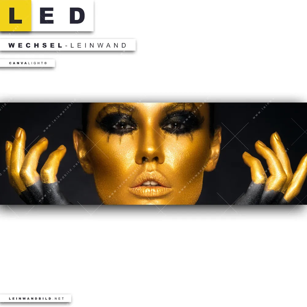 Du bist auf der Suche nach einer Porträts - Menschen Wechsel-Leinwand für Dein LED-Leinwandbild im Panorama-Format? Begriffe wie Frau, Beauty, Gesicht, Körper, Lippen, Mund, Make-up haben Dich auf der Suche nach Deiner Ersatz-Leinwand für dein extra breites LED Wandbild mit wechselbarer Leinwand inspiriert? Farben wie Gold, Schwarz dürfen auf Deinem neuen Wechselmotiv für Dein XXL Leinwand-LED-Bild nicht fehlen und Leinwände im Modern Art Stil für Leuchtbilder passen perfekt zu Deinem Einrichtungsstil?