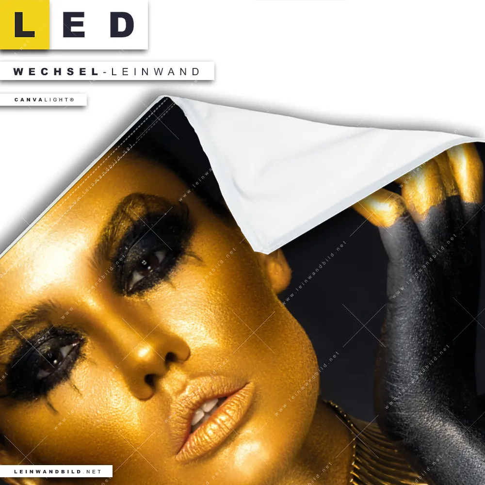 Bitte beachte, dass die Farben, der auf dem Monitor abgebildeten Sinnlichkeit in schwarz-gold Darstellung, möglicherweise von den Originalfarben deiner Canvalight® TEX Wechsel-Leinwand abweichen können.