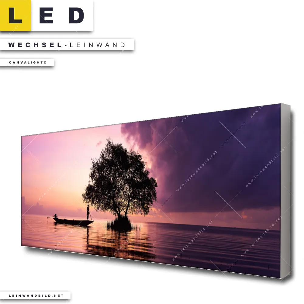 LED Wechsel-Leinwand Canvalight® TEX | Fischer auf Boot Sonnenaufgang | Panorama