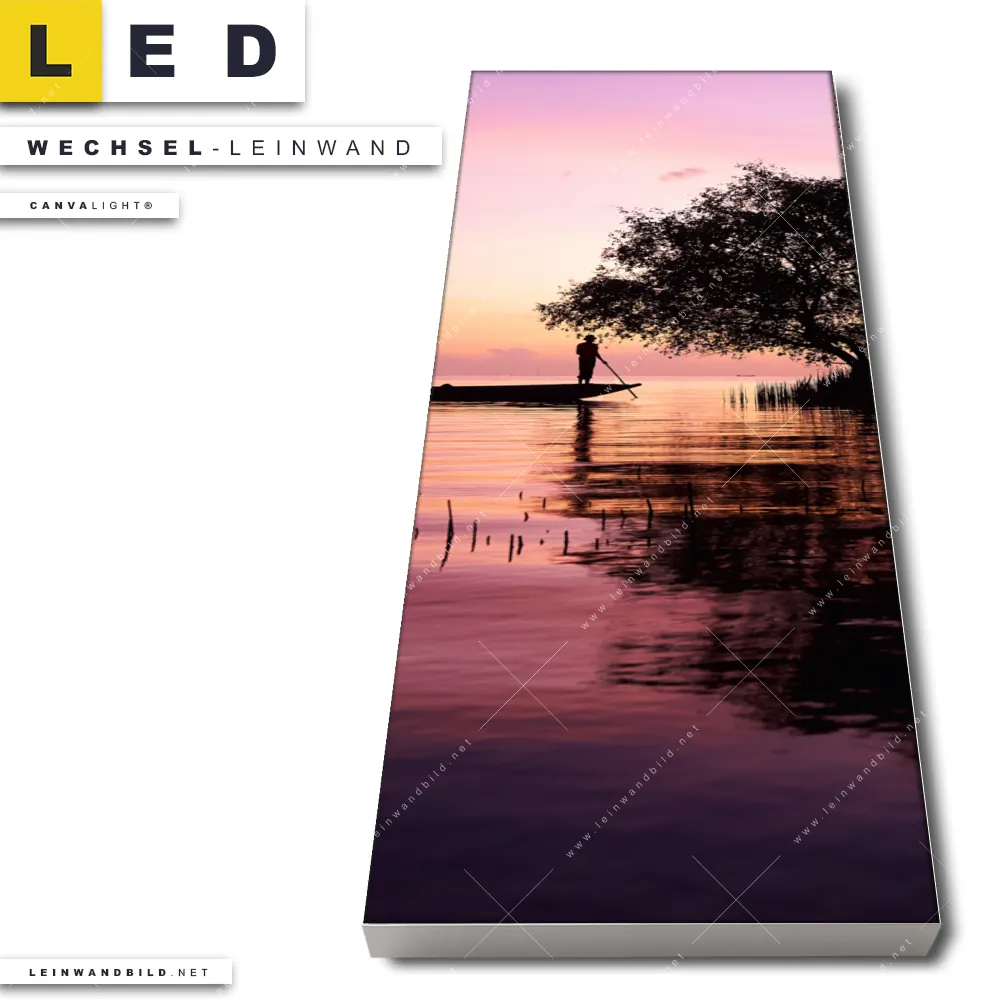 LED Wechsel-Leinwand Canvalight® TEX | Fischer auf Boot Sonnenaufgang | Schmal