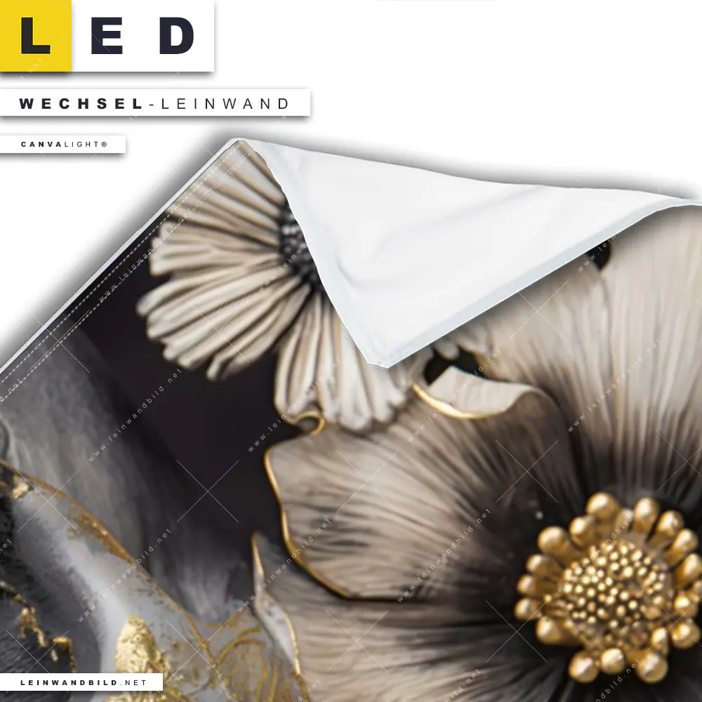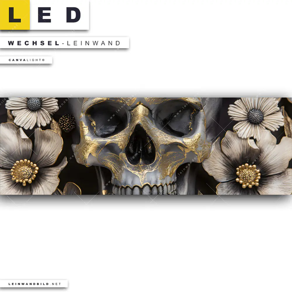Du bist auf der Suche nach einer Porträts - Menschen, Blumen - Botanik Wechsel-Leinwand für Dein LED-Leinwandbild im Panorama-Format? Begriffe wie Schädel, Totenkopf, Skelett, Skull, Knochen, Blumen, Blüten, Blätter, Pflanzen, Kopf haben Dich auf der Suche nach Deiner Ersatz-Leinwand für dein extra breites LED Wandbild mit wechselbarer Leinwand inspiriert? Farben wie Gold, Schwarz, Weiss, Grau dürfen auf Deinem neuen Wechselmotiv für Dein XXL Leinwand-LED-Bild nicht fehlen und Leinwände im Floral, Modern Art Stil für Leuchtbilder passen perfekt zu Deinem Einrichtungsstil?
