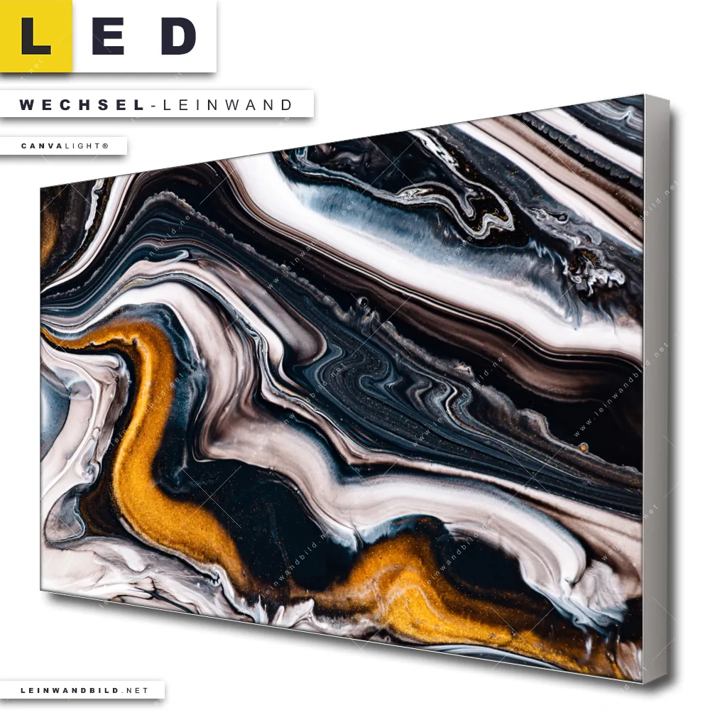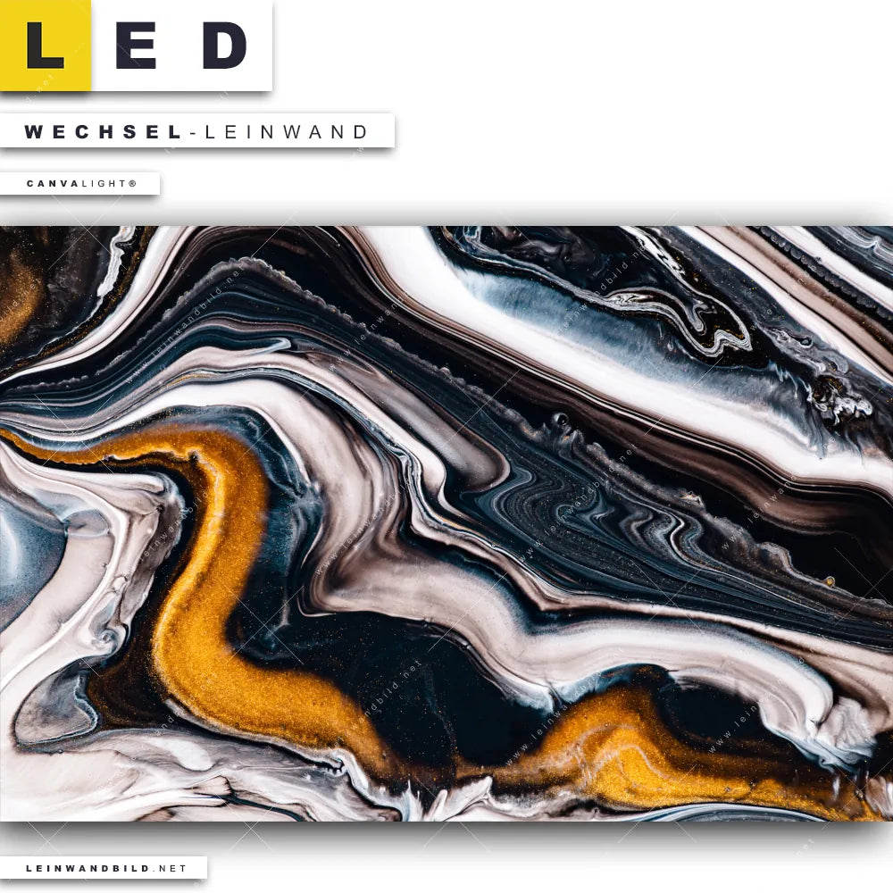 Du bist auf der Suche nach einer Muster - Texturen Wechsel-Leinwand für Dein LED-Leinwandbild im Querformat? Begriffe wie Flüssigkeit, Acryl, flüssig, Farbe, Marmorierung, Tinte, Alkohol, Goldader, Fluid Art haben Dich auf der Suche nach Deiner Ersatz-Leinwand für dein breites LED Wandbild mit wechselbarer Leinwand inspiriert? Farben wie Gold, Weiss, Schwarz, Blau dürfen auf Deinem neuen Wechselmotiv für Dein XXL Leinwand-LED-Bild nicht fehlen und Leinwände im Abstrakt, Modern Art Stil für Leuchtbilder passen perfekt zu Deinem Einrichtungsstil?