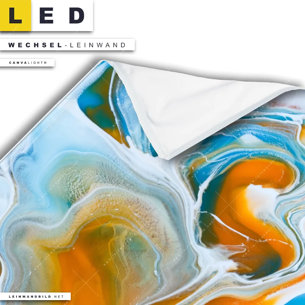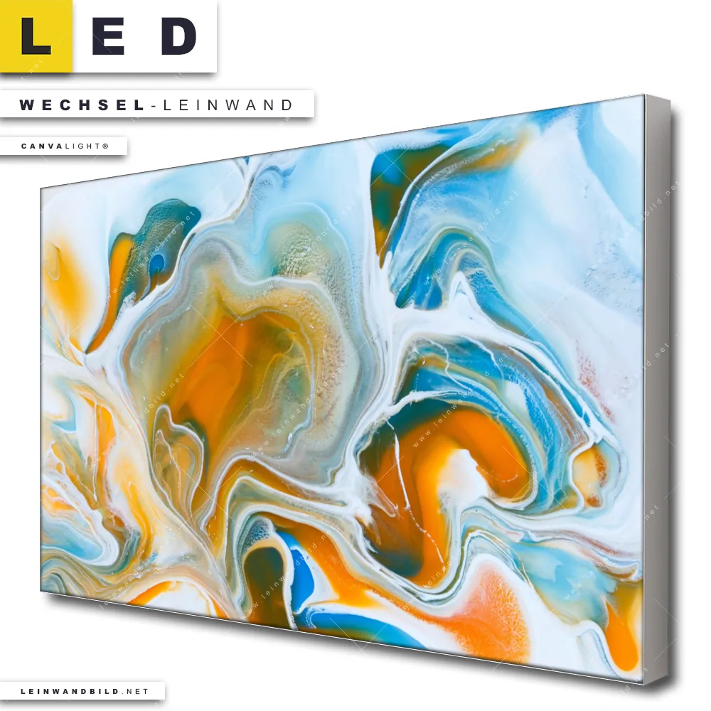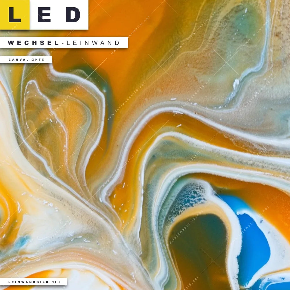 Du bist auf der Suche nach einer Muster - Texturen Wechsel-Leinwand für Dein LED-Leinwandbild im Querformat? Begriffe wie Flüssigkeit, Acryl, flüssig, Farbe, Marmorierung, Tinte, Alkohol, Fluid Art, Farben haben Dich auf der Suche nach Deiner Ersatz-Leinwand für dein breites LED Wandbild mit wechselbarer Leinwand inspiriert? Farben wie Blau, Weiss, Beige, Ocker, Orange, Hellblau dürfen auf Deinem neuen Wechselmotiv für Dein XXL Leinwand-LED-Bild nicht fehlen und Leinwände im Abstrakt, Modern Art Stil für Leuchtbilder passen perfekt zu Deinem Einrichtungsstil?