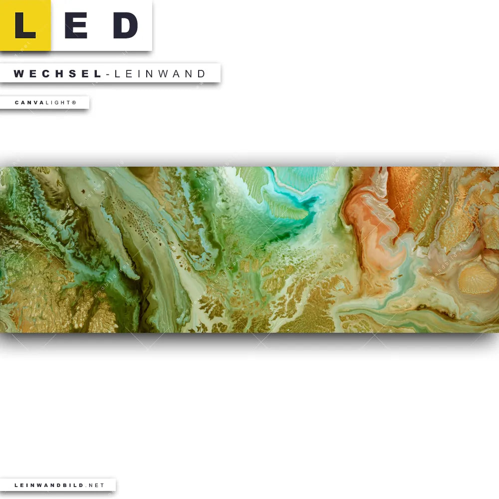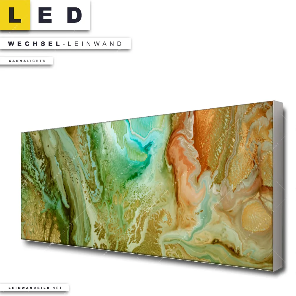 Du bist auf der Suche nach einer Muster - Texturen Wechsel-Leinwand für Dein LED-Leinwandbild im Panorama-Format? Begriffe wie Flüssigkeit, Acryl, flüssig, Farbe, Marmorierung, Tinte, Alkohol, Landschaft, Natur, Wald, Fluid Art haben Dich auf der Suche nach Deiner Ersatz-Leinwand für dein extra breites LED Wandbild mit wechselbarer Leinwand inspiriert? Farben wie Hellgrün, Grün, Beige, Türkis dürfen auf Deinem neuen Wechselmotiv für Dein XXL Leinwand-LED-Bild nicht fehlen und Leinwände im Abstrakt, Modern Art Stil für Leuchtbilder passen perfekt zu Deinem Einrichtungsstil?